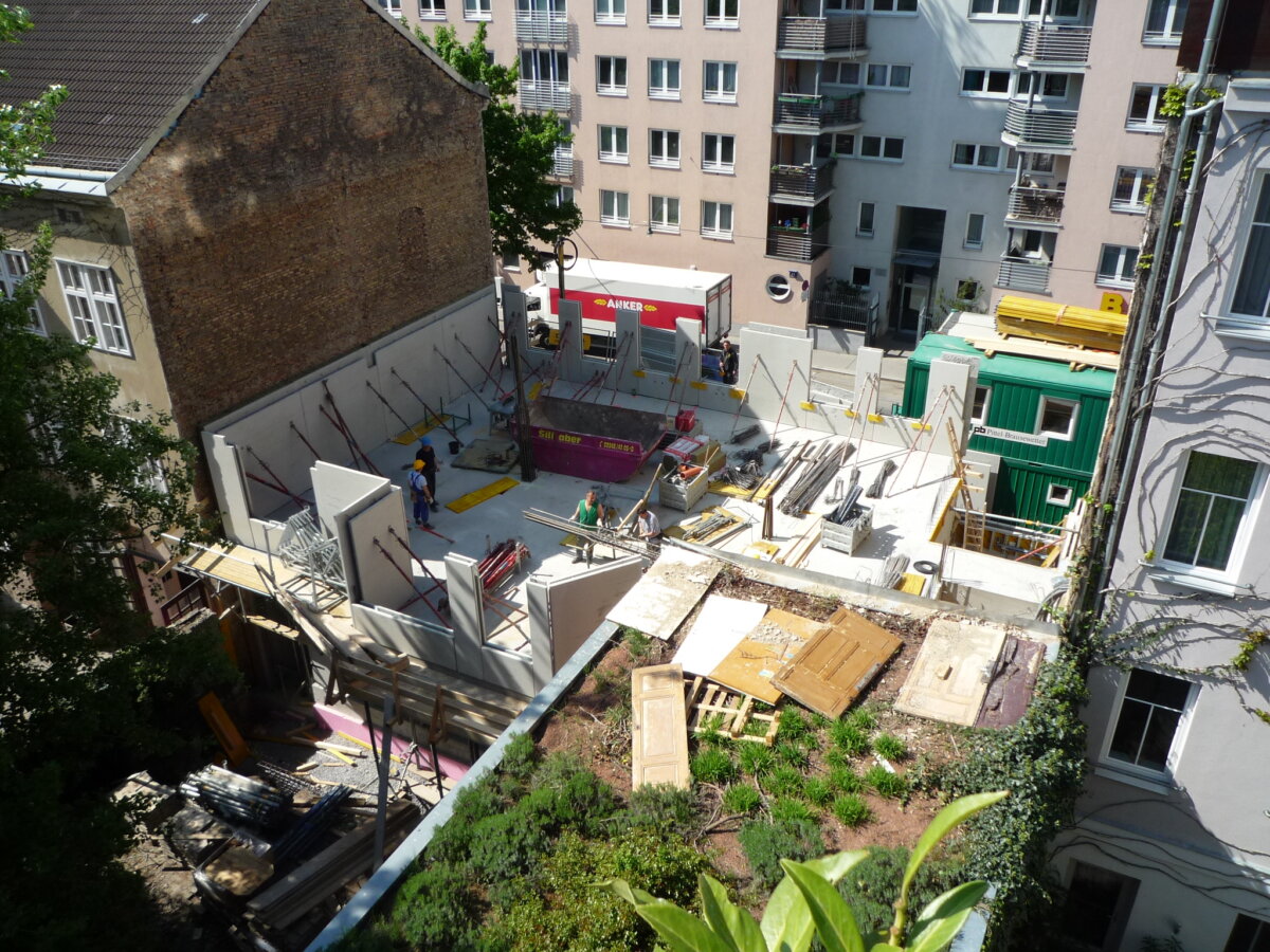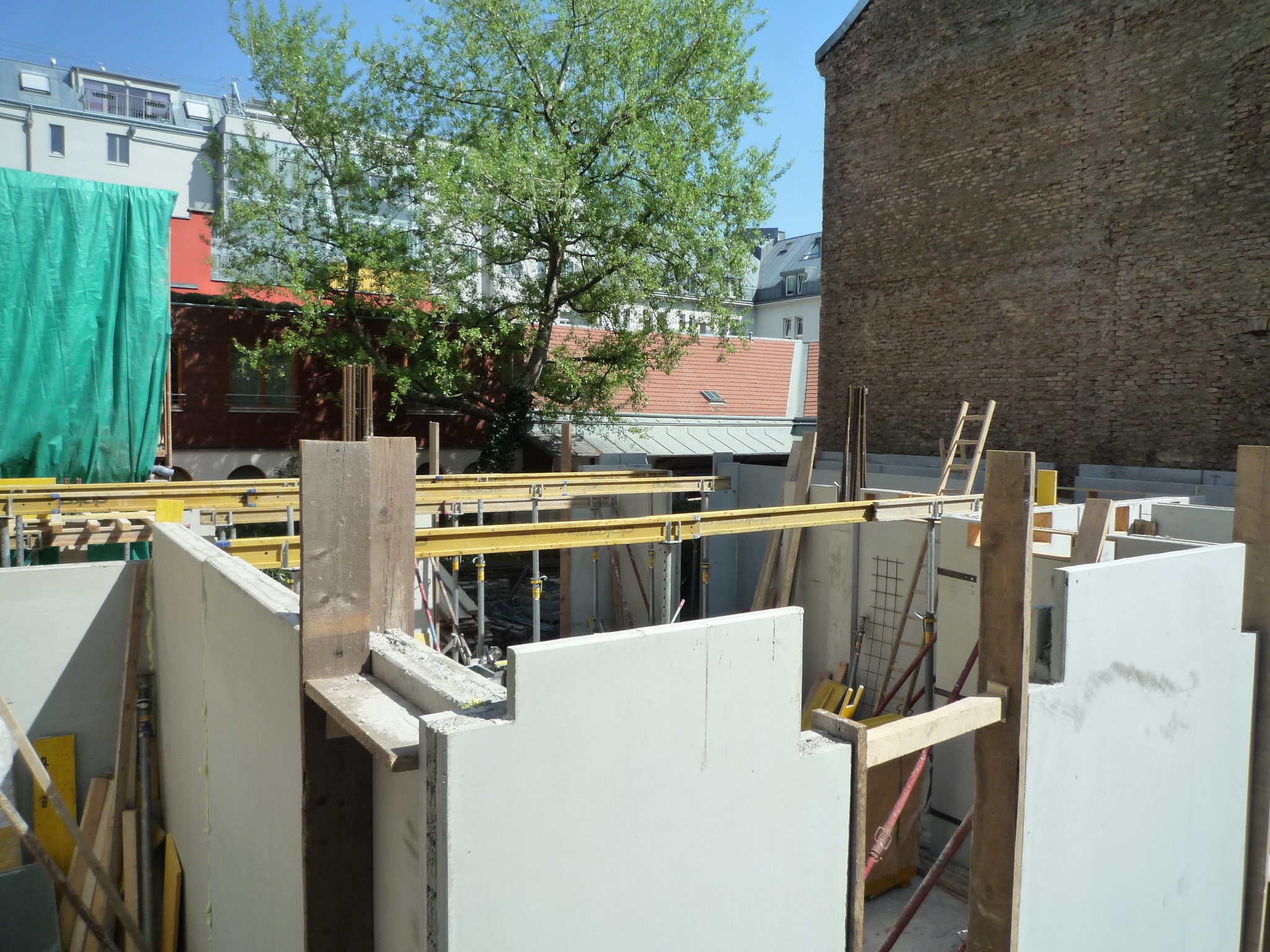 - Hackengasse 18: Neuerrichtung als Passivhaus: Außenwand: Stahlbeton mit 20 cm EPS Dämmplatten sowie zusätzlicher Innendämmung (7,5 cm Mineralwollklemmplatten) um den erforderlichen U-Wert < 0,15 W/(m2K) zu erreichen (U = 0,118 W/(m2K))