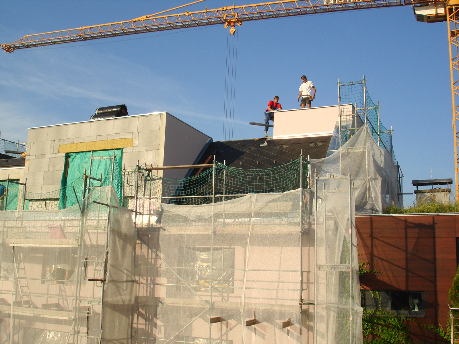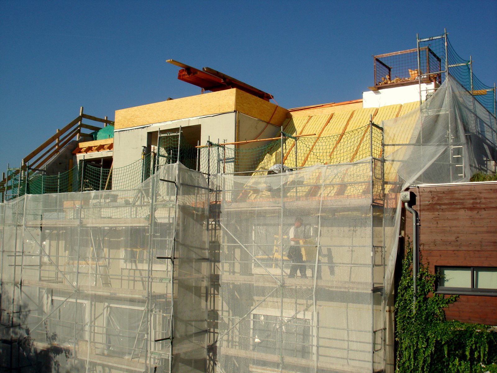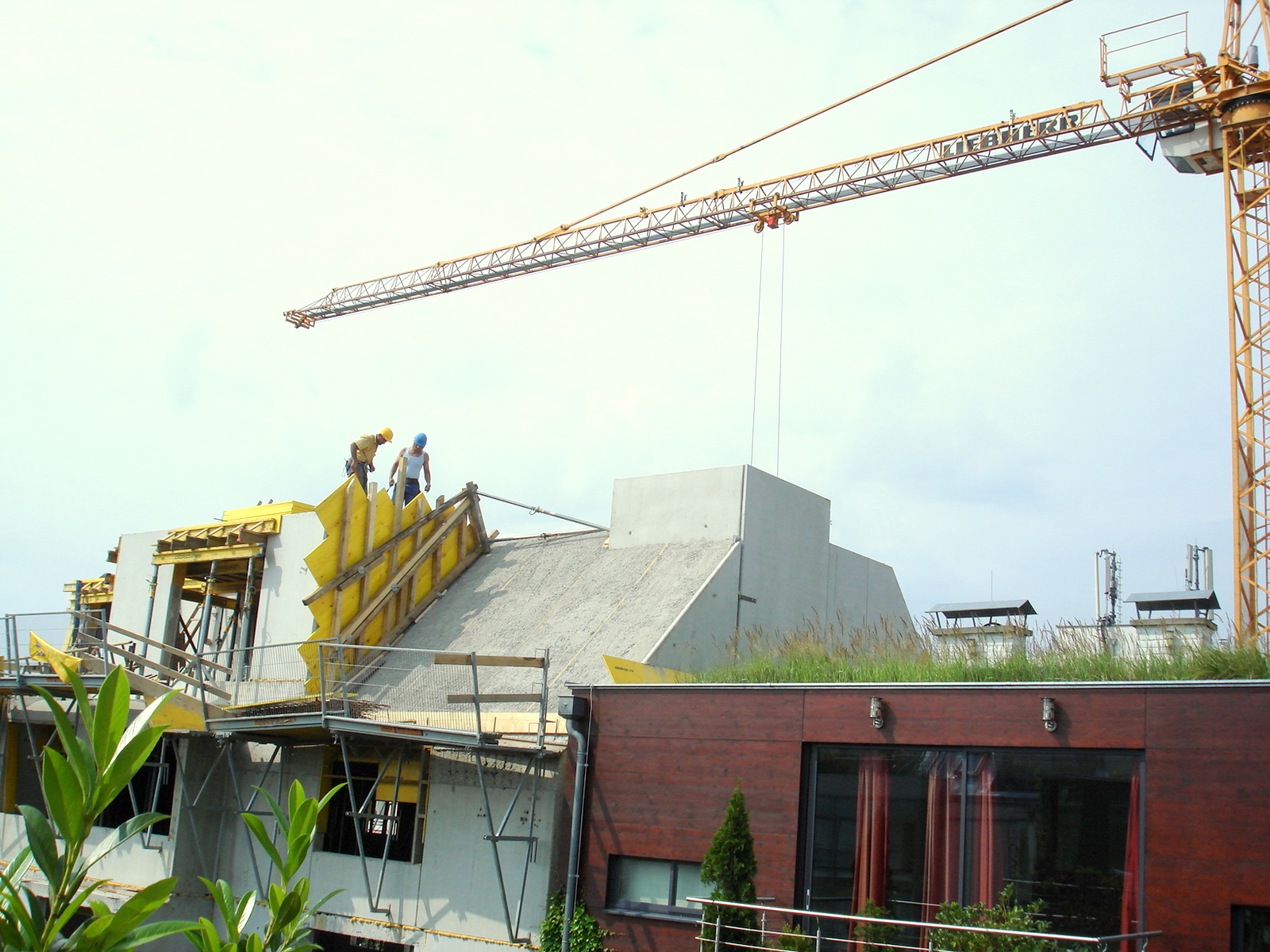 - Dachkonstruktion: Ortbeton mit 40 cm Mineralwolldämmplatten U = 0,100 W/(m2K)