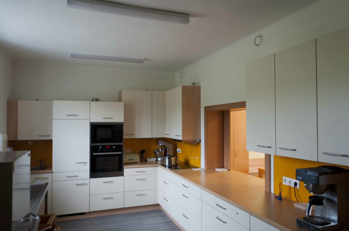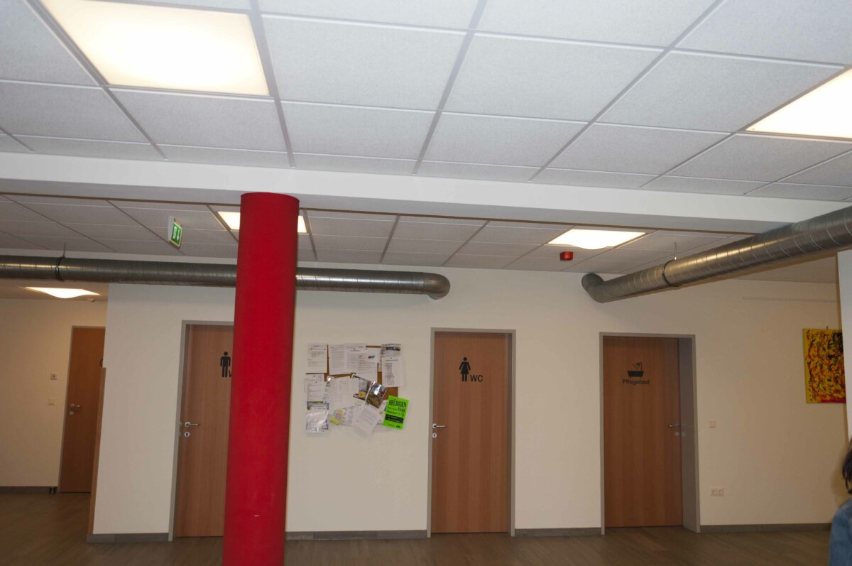 • Neben dem schlechten thermischen Zustand des Gebäudes, der alten Ölheizung, dem Platzmangel war vor allem die fehlende Barrierefreiheit eine Schwachstelle des alten Gebäudes. Ein Lift fehlte und es gab keine Inkontinenzversorgung. Für Mitarbeiter mit schwerer körperlicher Behinderung gab es weiters keinen Raum und es fehlte auch an Platz um eine Außengruppe zu integrieren.