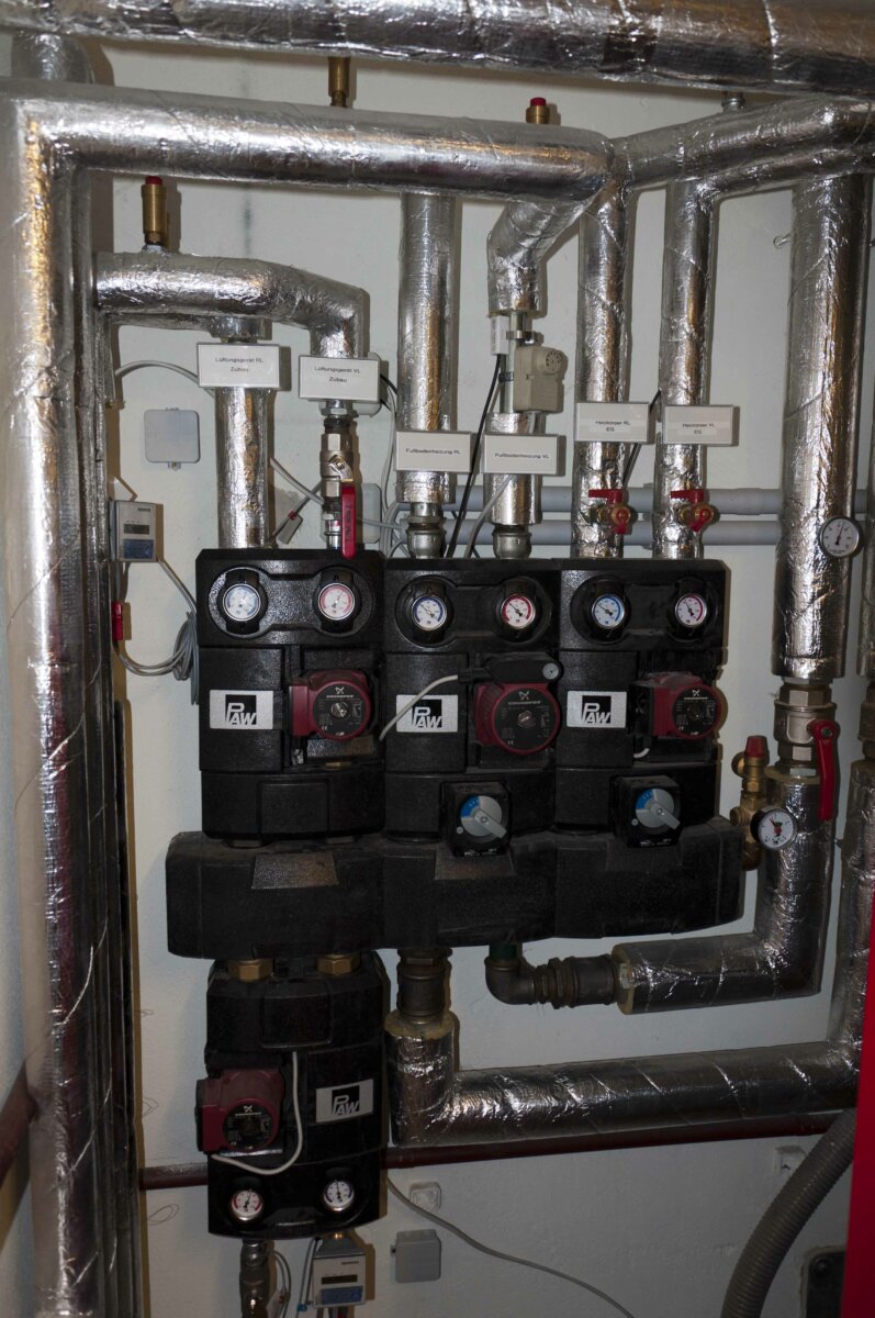 Die Wärmeversorgung wird von einem Heizölkessel auf einen Pelletskessel mit einer Leistung von 98 kW umgestellt. Die Flachkollektor-Solaranlage speist in einen 1.800 Liter Pufferspeicher ein, und trägt zu 30 % zur Warmwasserbereitung und zu 70 % zur Heizungsunterstützung bei. Die neue Heizungsverteilung erfolgt über eine Niedertemperatur-Fußbodenheizung sowie Radiatoren.