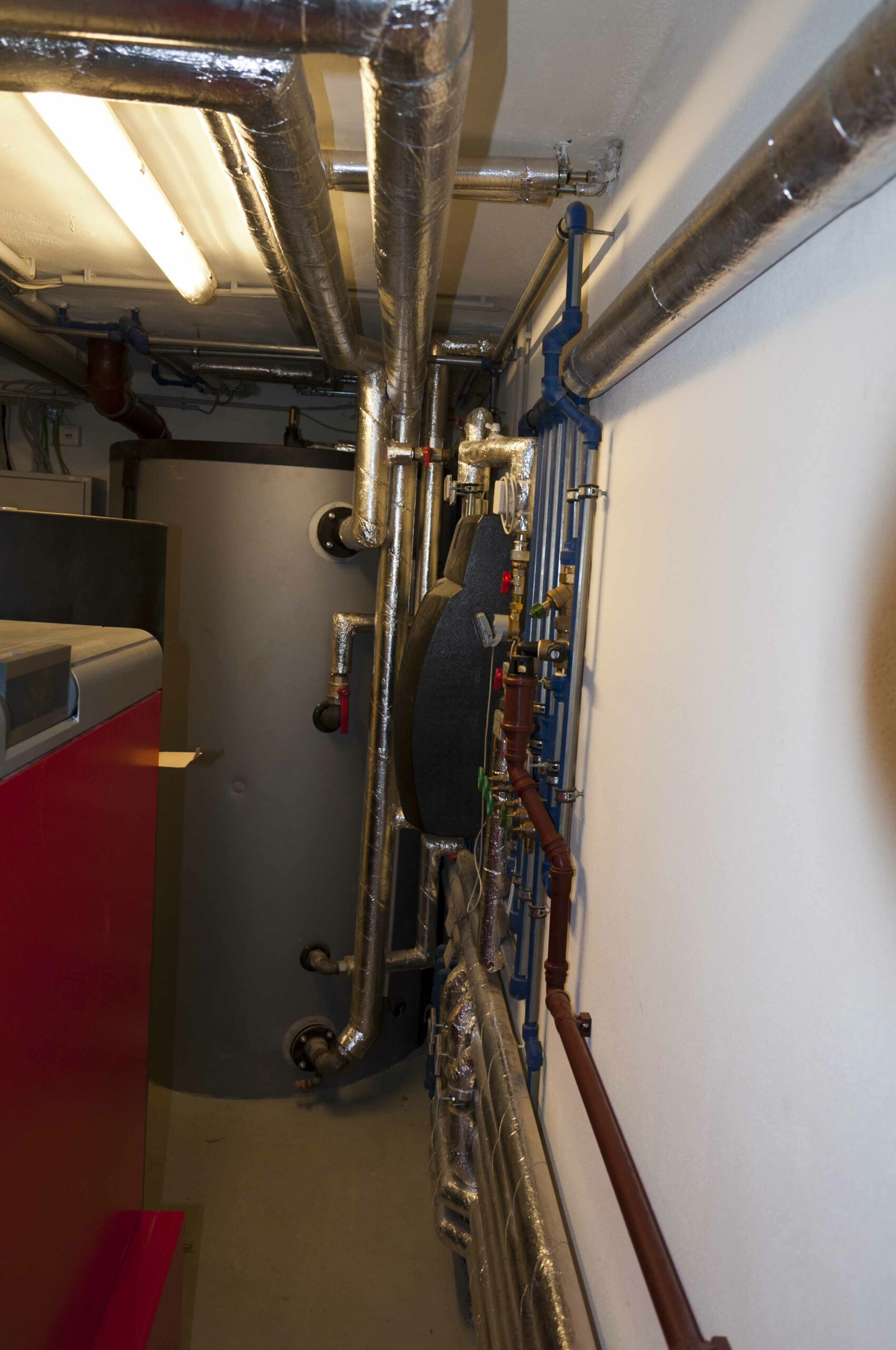 • Die Wärmeversorgung des Gebäudes erfolgt über eine Pelletsheizung mit einer Leistung von 98 kW. Der alte Ölkessel wurde entsorgt. Die Flachkollektor-Solaranlage (10 x 2,5 m2) speist in einen 2.000 Liter fassenden Pufferspeicher ein und wird zu 30% für die Warmwasserbereitung verwendet, sowie zu 70% für die Raumheizung.