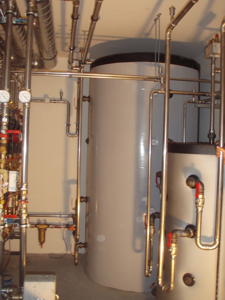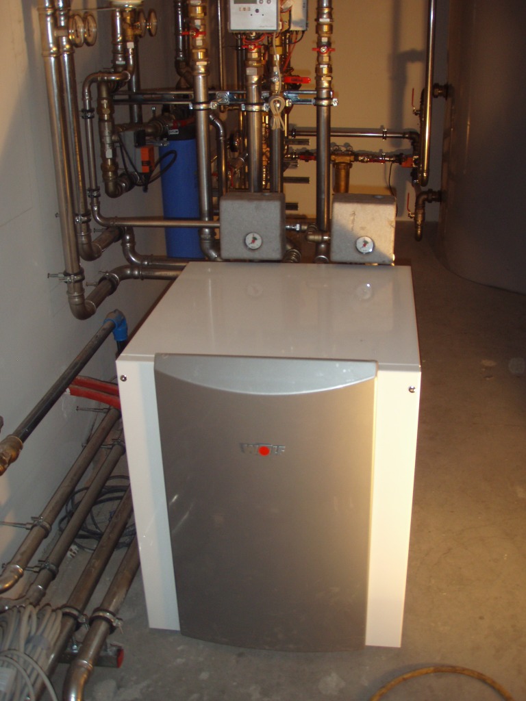 Der bestehende Ölkessel zur Beheizung des Gebäudes, sowie die elektrisch betriebenen Durchlauferhitzer zur Warmwasserbereitung werden entsorgt. Das neue System umfasst eine Wasser-Wasser-Wärmepumpe in Kombination mit einer thermischen Solaranlage. Die Flachkollektoren mit einer Fläche von 20 m² werden zu 41 % zur Warmwasseraufbereitung und zu 59 % zur Raumheizung beitragen. Die Heizungsverteilung erfolgt über eine Niedertemperatur-Fußbodenheizung und Radiatoren.