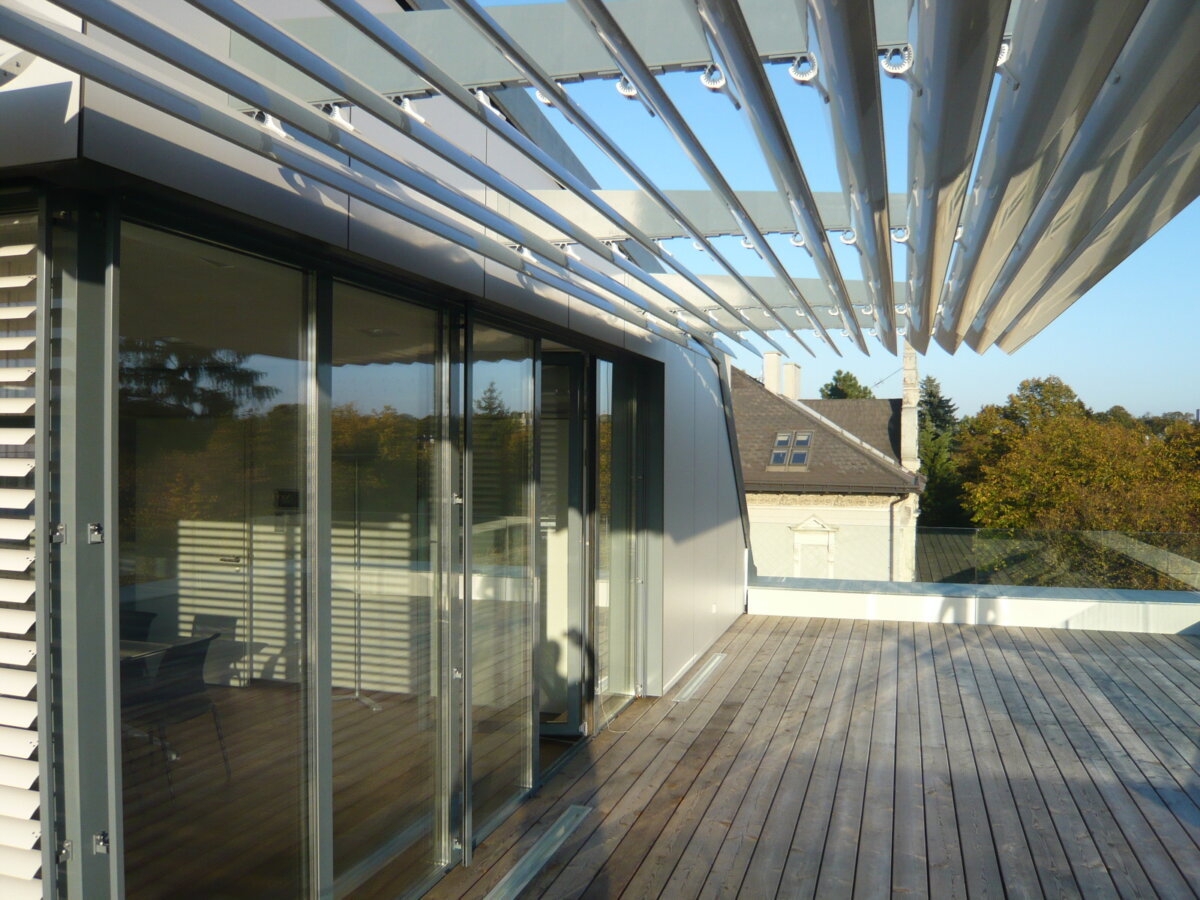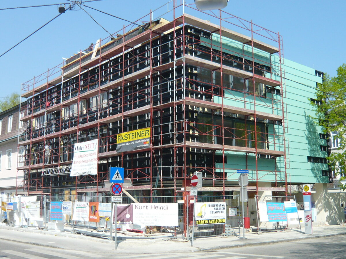 • 20 cm Vollwärmeschutz zusätzlich zu den Bestandsdämmplatten 2x 3,5cm Heraklith und ab OG1 hinterlüftete Glasschuppen- und Eternitfassade; Dach 26+5cm Zwischensparrendämmung, 5cm Perimeterdämmung