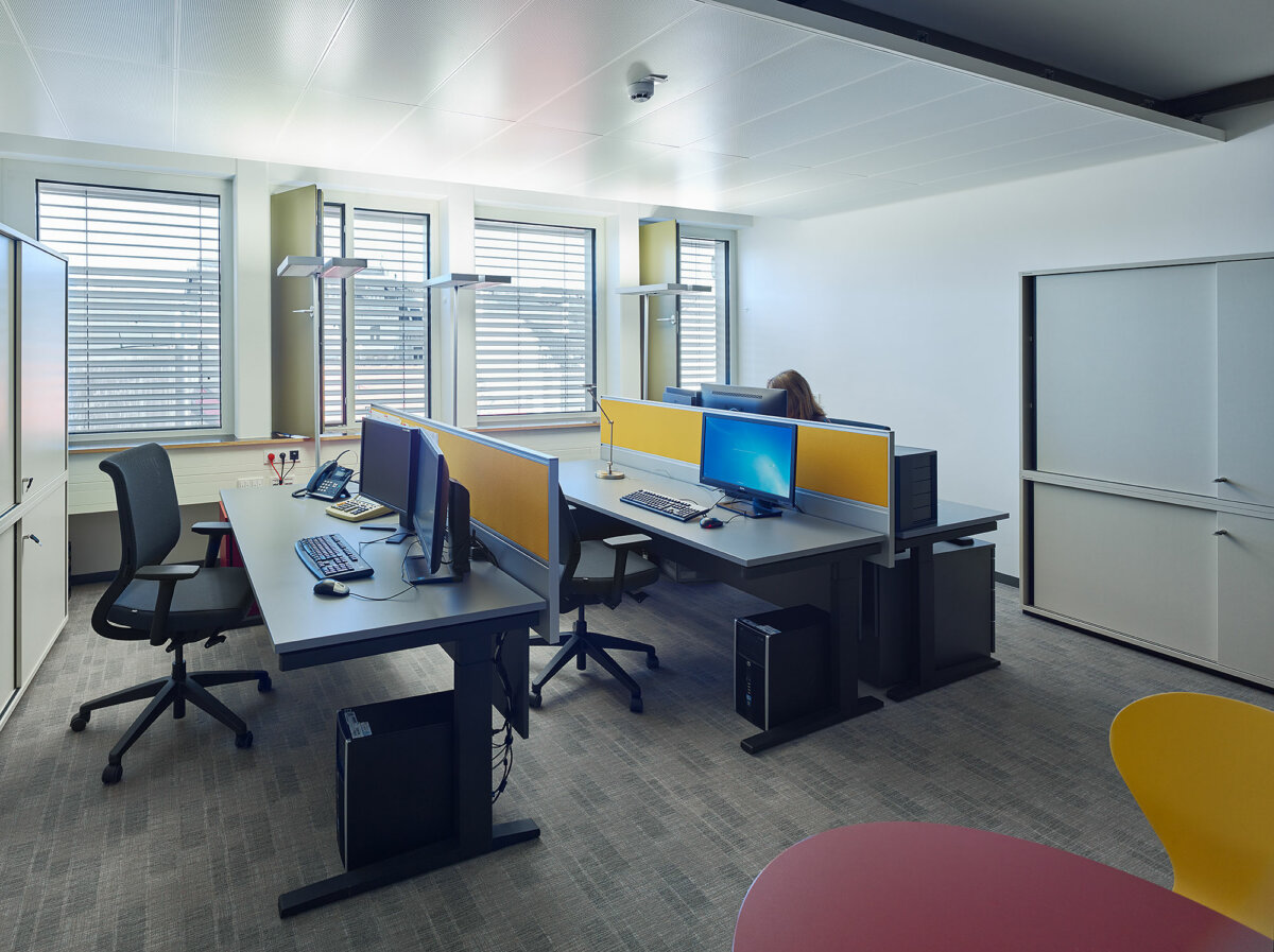 - Durch Maßnahmen wie Farbgebung im Fenstersturzbereich, Lichtlenklamellen bei den Außenraffstore-Verschattungen und tageslichtgeregelte Kunstlichtregelung wurde im Zuge der Sanierung der Anteil an Tageslichtnutzung maximiert. Die Kunstlichtanlage wurde auf hohem Energieeffizienzstandard geplant.