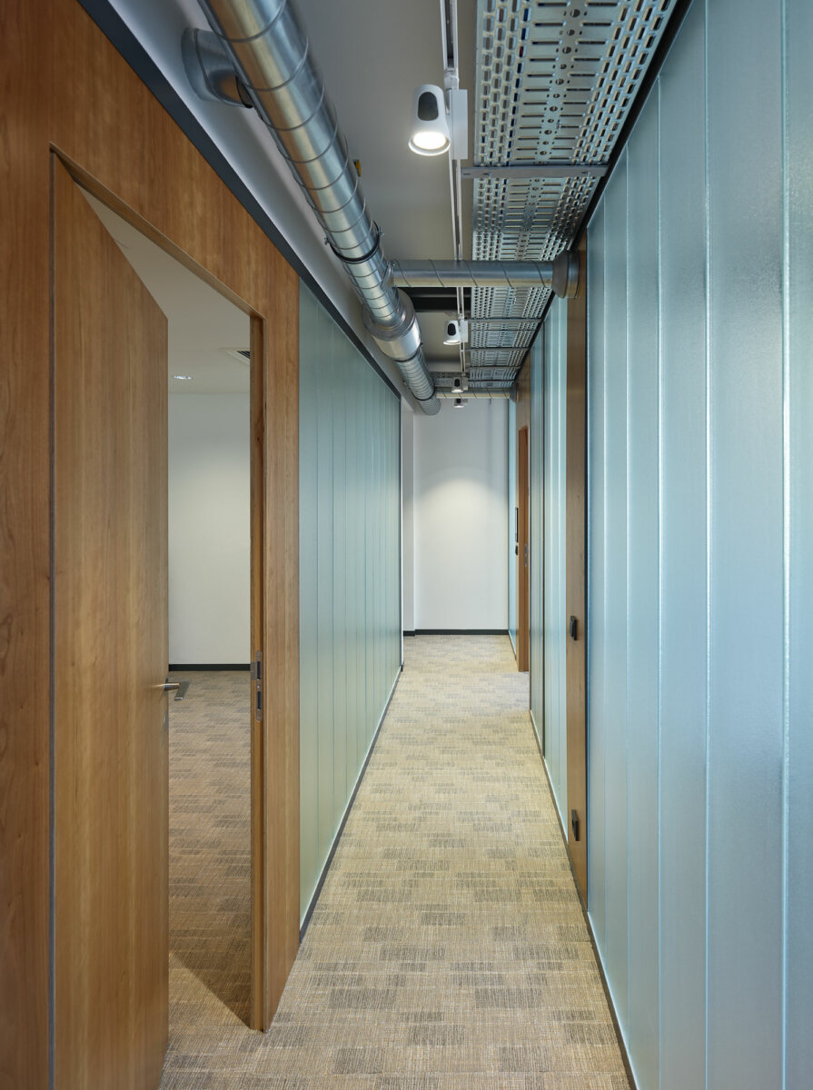 Für die Beschattung wurden außenliegende Raffstore mit Tageslichtlenkung und Temperaturgesteuertem Motorantrieb installiert. Die Regelung erfolgt automatisiert nach Einstrahlung auf die Fassade und bietet eine Möglichkeit der Übersteuerung durch die Nutzer. Eine mechanische Lüftungsanlage mit Wärme- und Feuchterückgewinnung (mind. 80%) zur Versorgung der Bürogeschosse mit kontrollierter Be- und Entlüftung in Passivhausqualität wurde installiert.