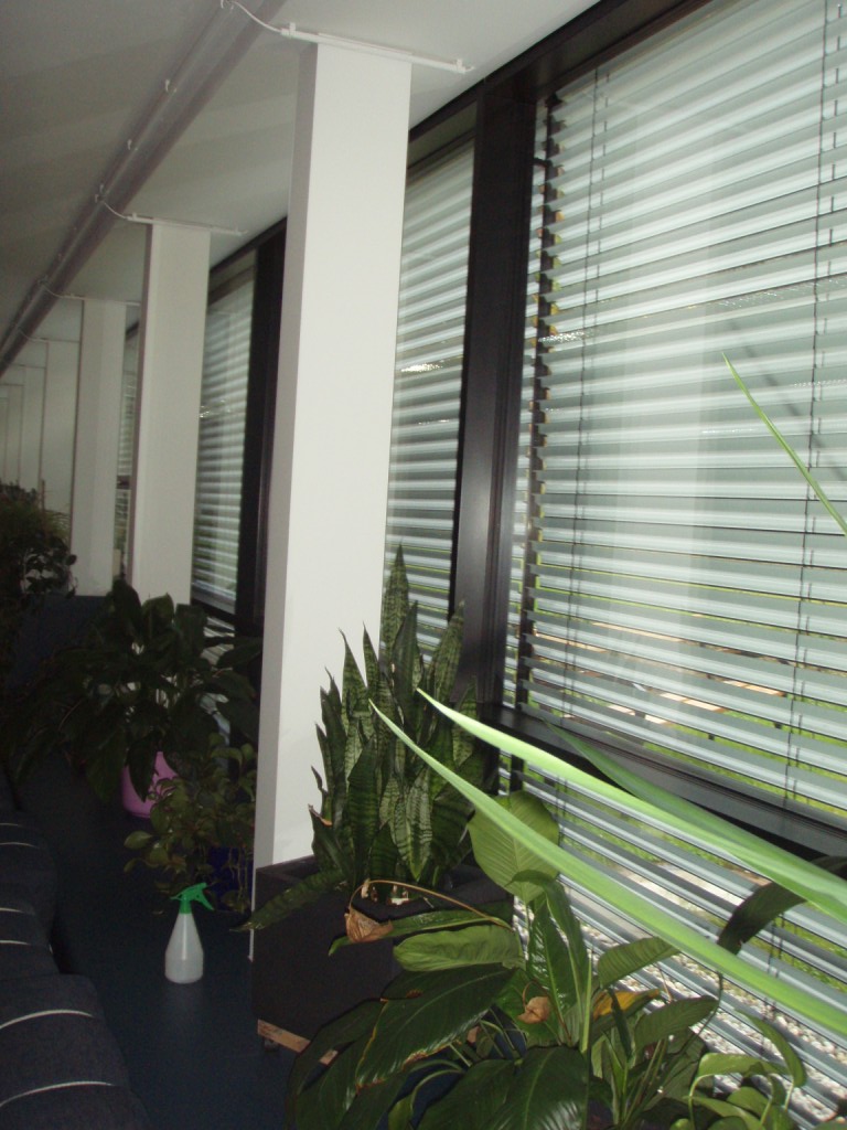 - Die Beschattung ist durch händisch gesteuerte Außenraffstore gegeben.