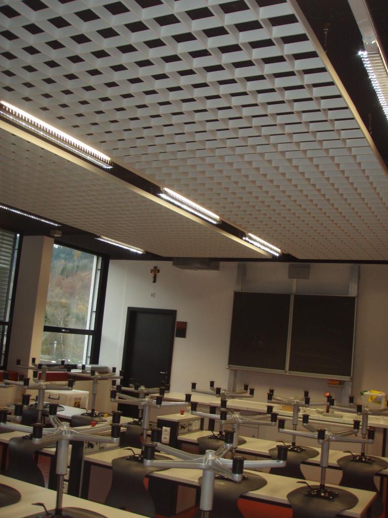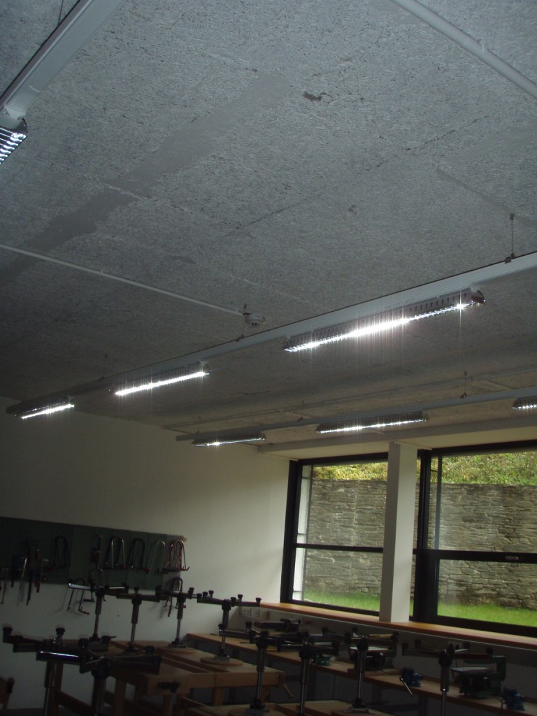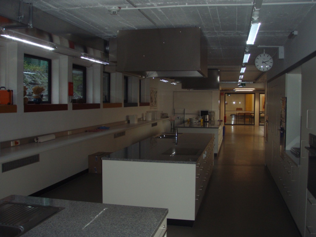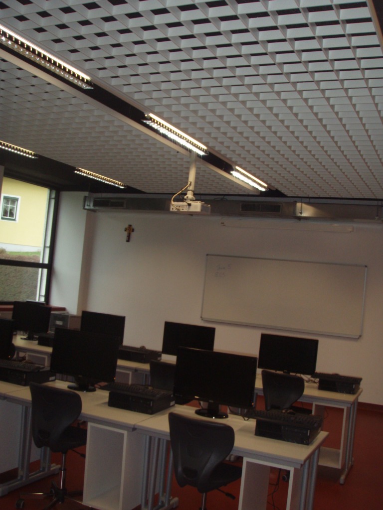 - Der Gesamtstromverbrauch des Gebäudes betrug im Bestand rund 26,5 MWh/a, wovon rund 17 MWh/a auf die Beleuchtung entfielen. Die bestehende Beleuchtungsanlage entspricht in Bezug auf die Lichtmenge dem heutigen Stand der Normung, allerdings sind noch konventionelle Betriebsgeräte mit PCB-haltigen Kondensatoren im Einsatz, welche sehr ineffizient sind. Die ineffiziente Bestands-beleuchtung wurde nun auf effiziente Leuchten und Leuchtmittel (LED bzw. effiziente Leuchtstofflampen) umgestellt.