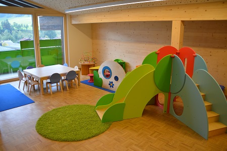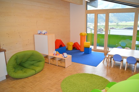 Die Gemeindevertretung von Leogang hat in der Sitzung vom 07. Mai 2014 den Baubeschluss für die Erweiterung bzw. die Sanierung des Kindergartens in Sonnrain gefasst. Nach einem ca. 2 Jahre andauernden Planungsprozess wurde der Planungsentwurf der Fa. W2 Manufaktur GmbH von der Gemeindevertretung abgesegnet und die ersten Vergabebeschlüsse an die ausführenden Firmen gefasst. Auf Grund des über 35 Jahre alten Baubestandes war es von Anfang an vorgesehen, eine umfassende Sanierung der Gebäudehülle sowie der Innenräume durchzuführen. Neben der Anbringung eines Wärmedämmverbundsystems an der Fassade wurden sämtliche Fenster und Türen erneuert und die Beschattungssysteme getauscht. Auch die Dachkonstruktion und die Kelleraußenwände wurden mit einer Wärmedämmung ausgestattet. Auf Grund der enormen Energieeinsparung lt. Berechnung im Energieausweis wurde die Beibehaltung der Elektroheizung beschlossen. Durch den Einbau einer Wohnraumlüftungsanlage mit Wärmerückgewinnung konnte der Energiebedarf für die Elektroheizung zusätzlich wesentlich gesenkt werden. Für die zukünftige Energieversorgung ist die Errichtung einer Photovoltaikanlage im Gartenbereich vorgesehen. Diese Anlage deckt beinahe 100% des Hochtarif- Energiebedarfs ab. Für die Elektroheizungsanlage wurde ein zertifizierter Ökostromliefervertrag abgeschlossen.