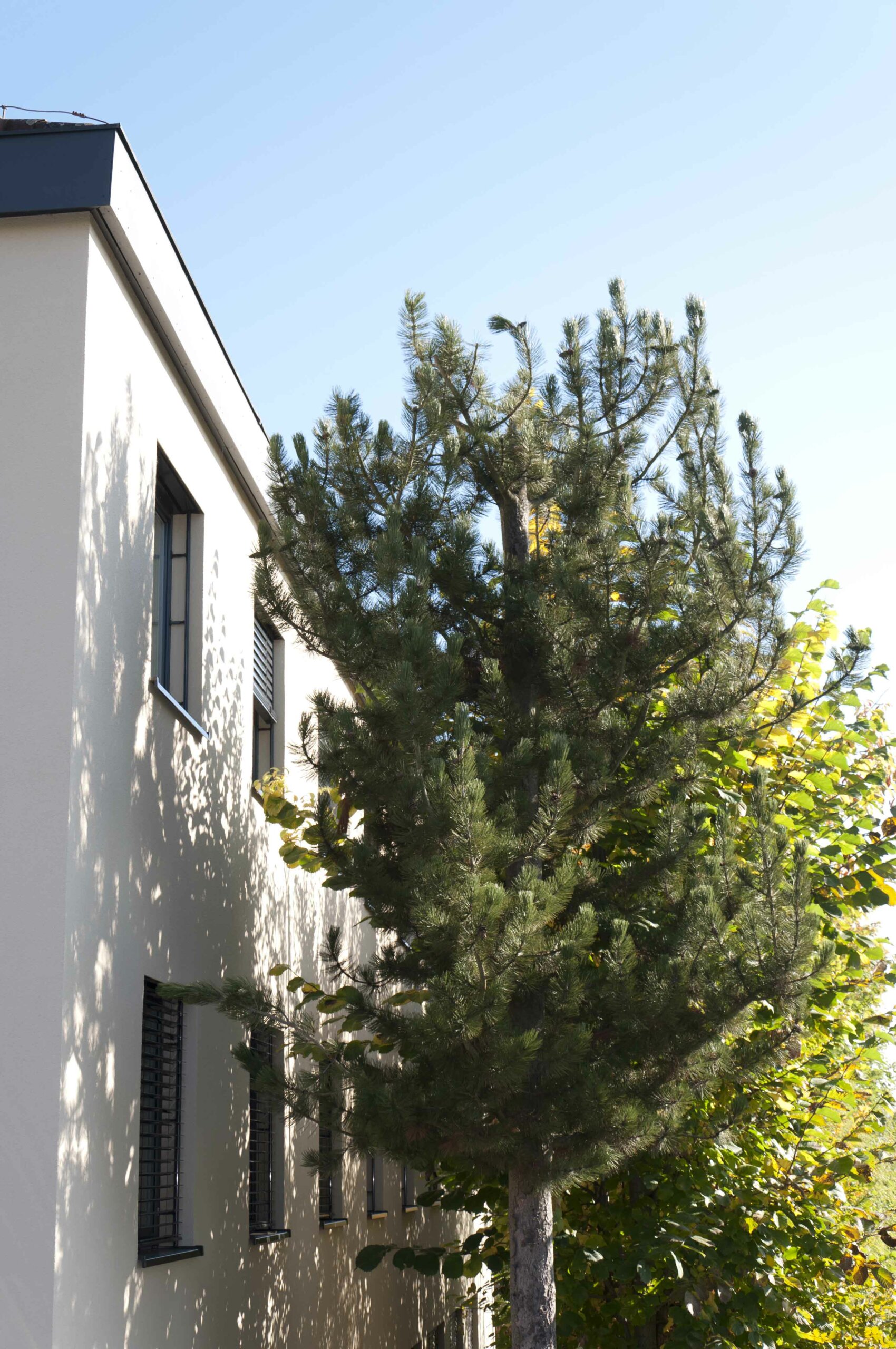- Zusätzlich wirkt sich die natürliche Verschattung durch die Baumreihe vor der Südfassade günstig aus. Ein geringerer solarer Eintrag durch die Glasflächen sowie eine geringere Aufheizung der Südfassade wird bewirkt.