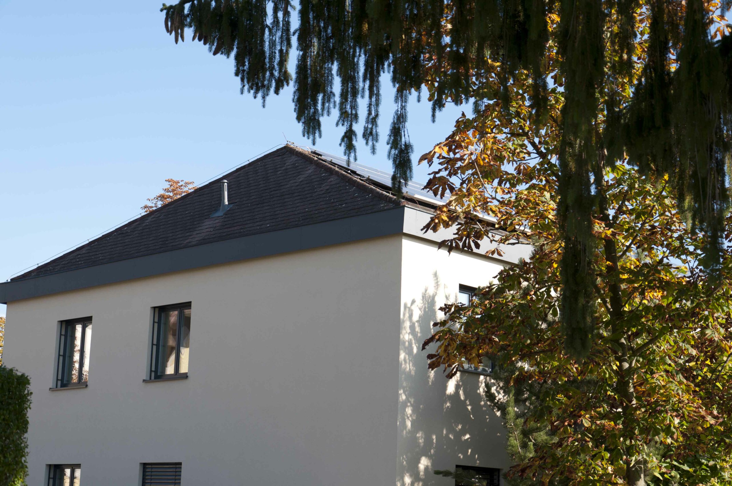 - Die Gebäudehülle, errichtet in Massivbauweise aus 38 cm Hochlochziegel, wird mit 20 cm Mineralschaumplatten gedämmt. Dadurch reduziert sich der U-Wert von 1,36 W/(m²K) auf 0,19 W/(m²K).Der Perimeterbereich benötigt zur Dämmung 16 cm feuchtebeständige Platten (XPS), welche den U-Wert von 1,44 auf 0,19 W/(m²K) verbessern. Um keine unnötigen Wärmeverluste zu generieren und eine Flucht mit den Obergeschossen zu erhalten, entschloss sich der Bauherr zu einer Dämmstärke von 20 cm.