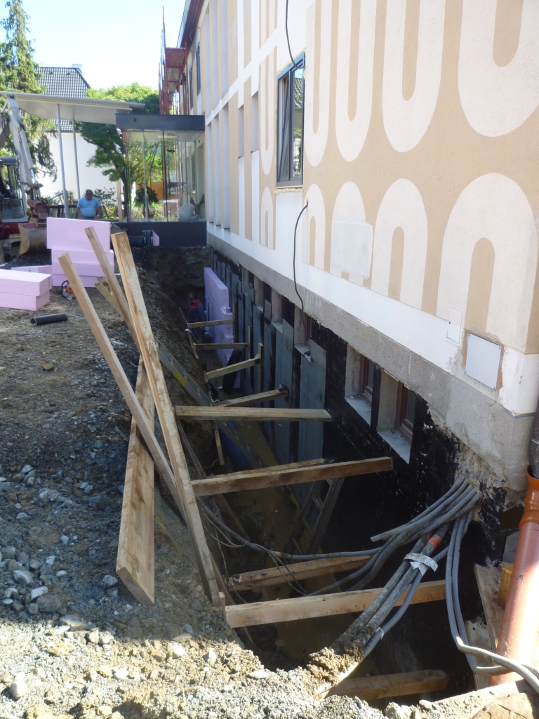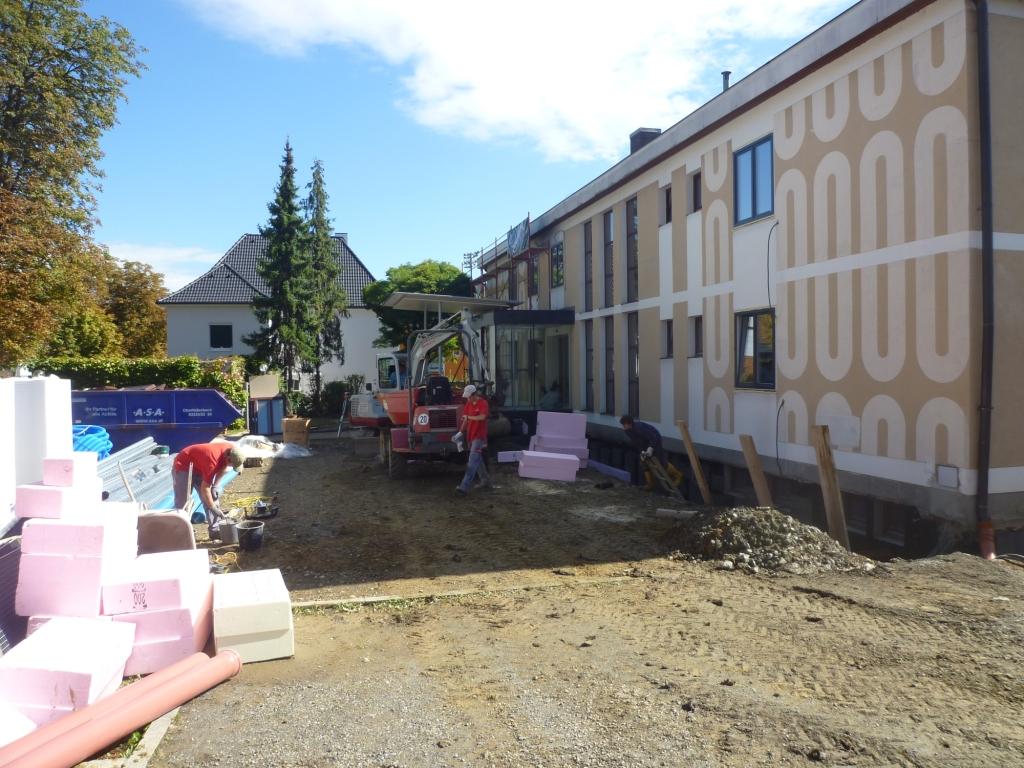 - Baustelleneinrichtung/Abbrucharbeiten um das Gebäude außen/ Aushub für die Perimeterdämmung/Aufbringung Perimeterdämmung