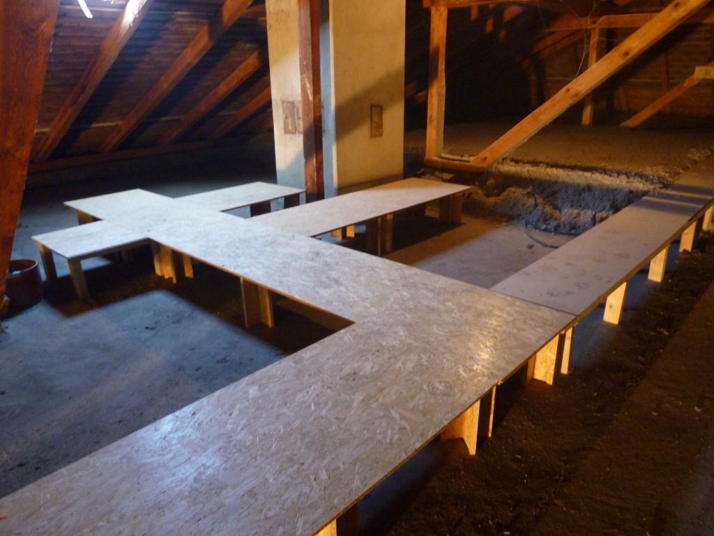 - Vorbereitungen für die Dämmung der obersten Geschoßdecke (Stege) sowie Aufbringung der Zellulosedämmung