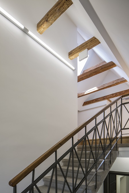 • Denkmalgeschützte Fenster: vor den bestehenden Elementen, in der Ebene der Innendämmung, wurde eine Wärmeschutzverglasung angebracht. Verbesserung des U-Werts der Fenster von 2,5 W/m²K auf 0,9 W/m²K (Fenster gesamt).
