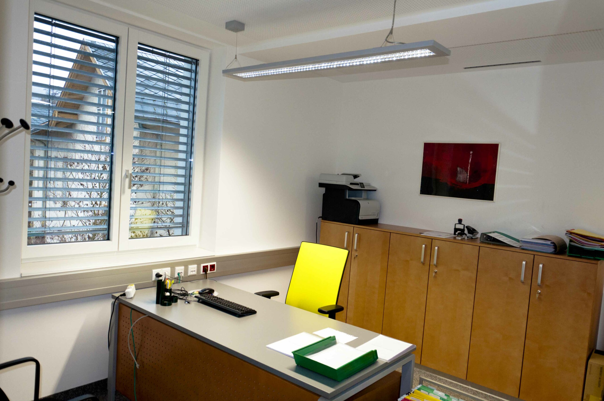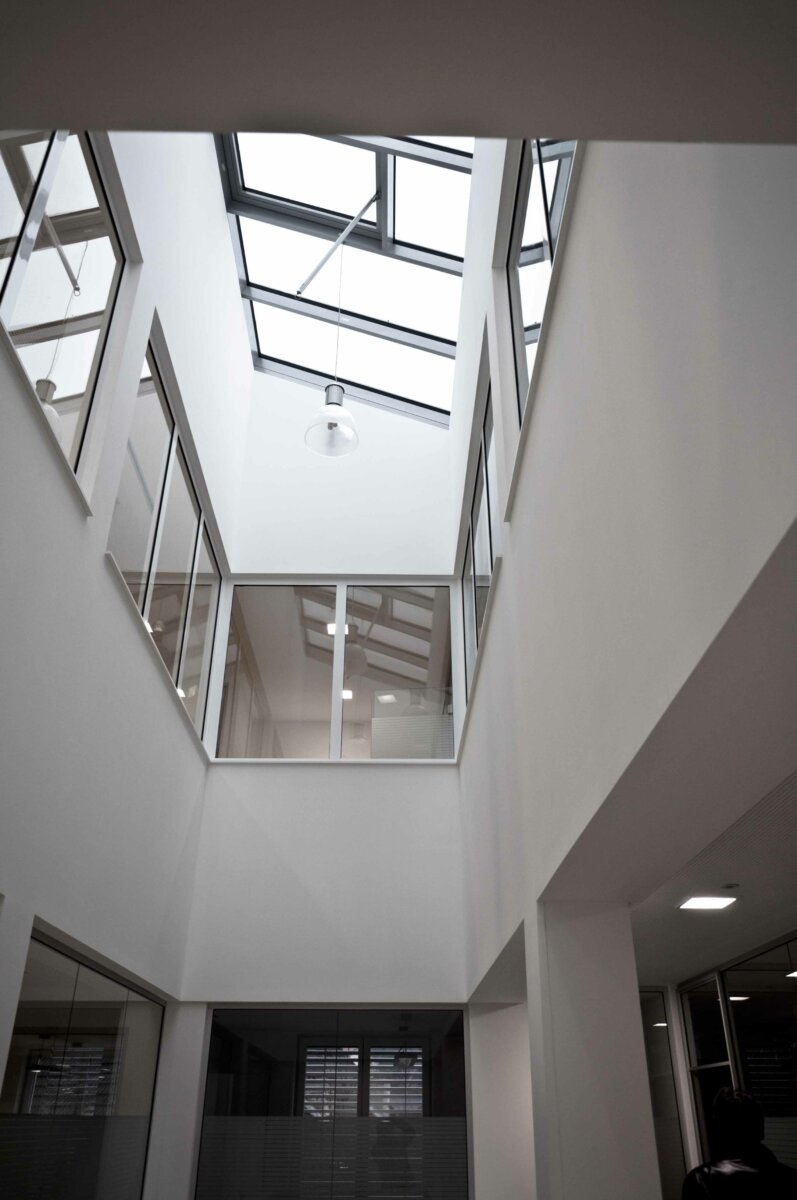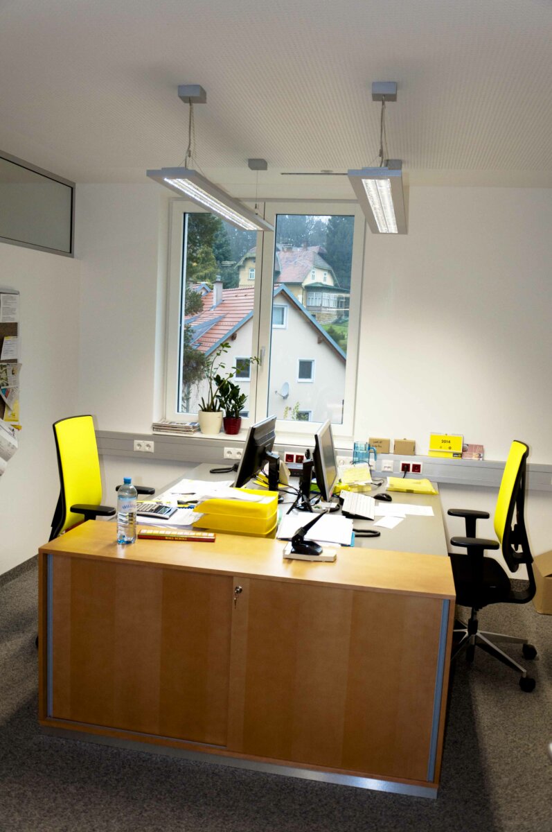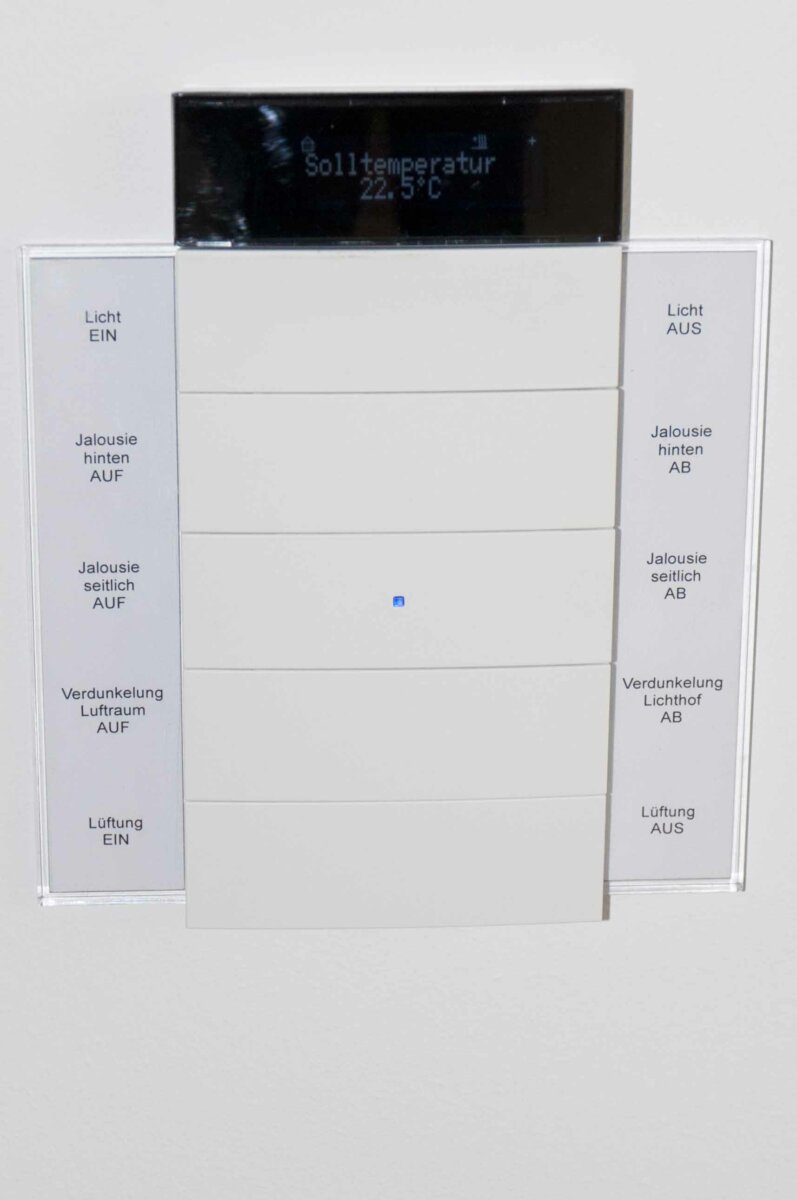 - Die Lichtsteuerung erfolgt mit einem außenlichtabhängigen Sensor, kann jedoch individuell übersteuert werden. Durch die zentrale „Licht-Aus“ Funktion sowie den Präsenzmeldern in den Sozial- und Sanitärräumen, liegt das Einsparpotential bei 20% gegenüber konventionellen Lichtsteuerungen. Die Lichtsteuerung ist flexibel und jederzeit erweiterbar. Auch die Raffstore wurden in die Lichtsteuerung integriert.