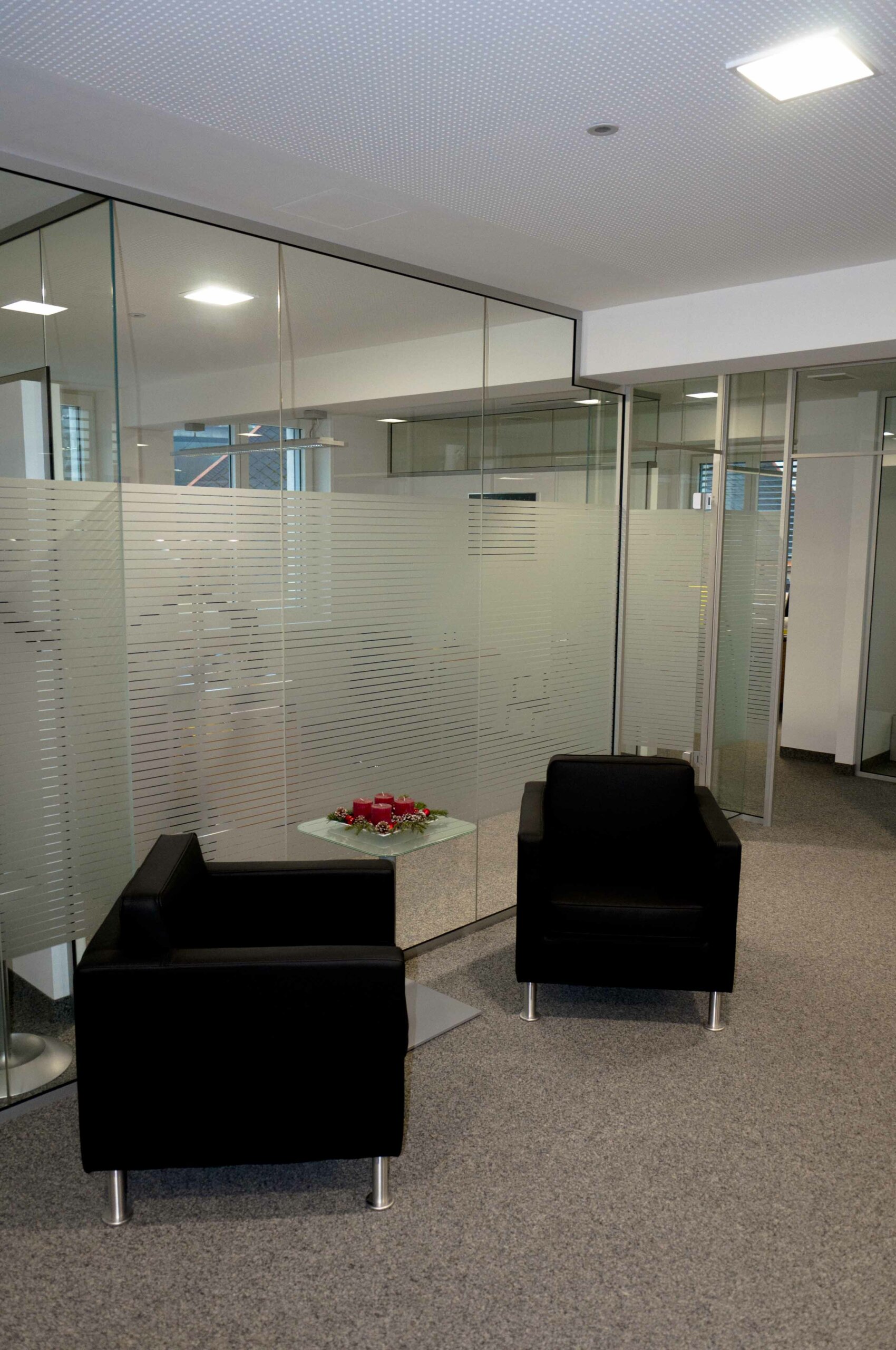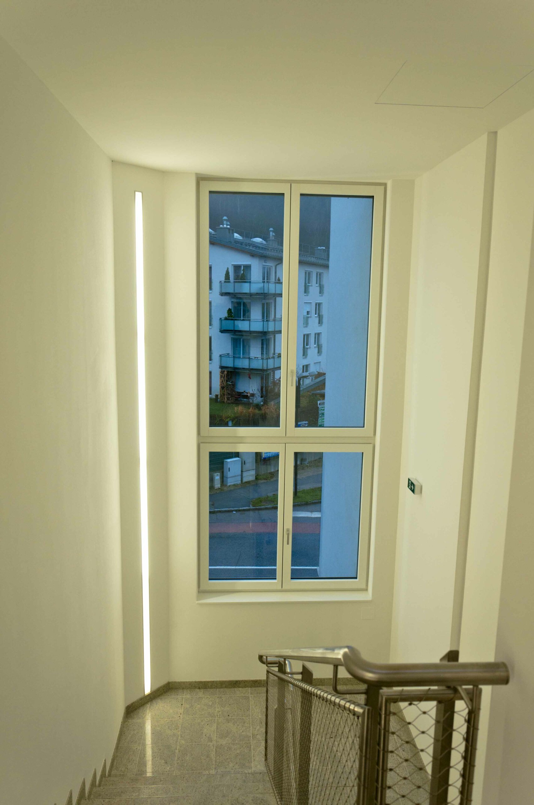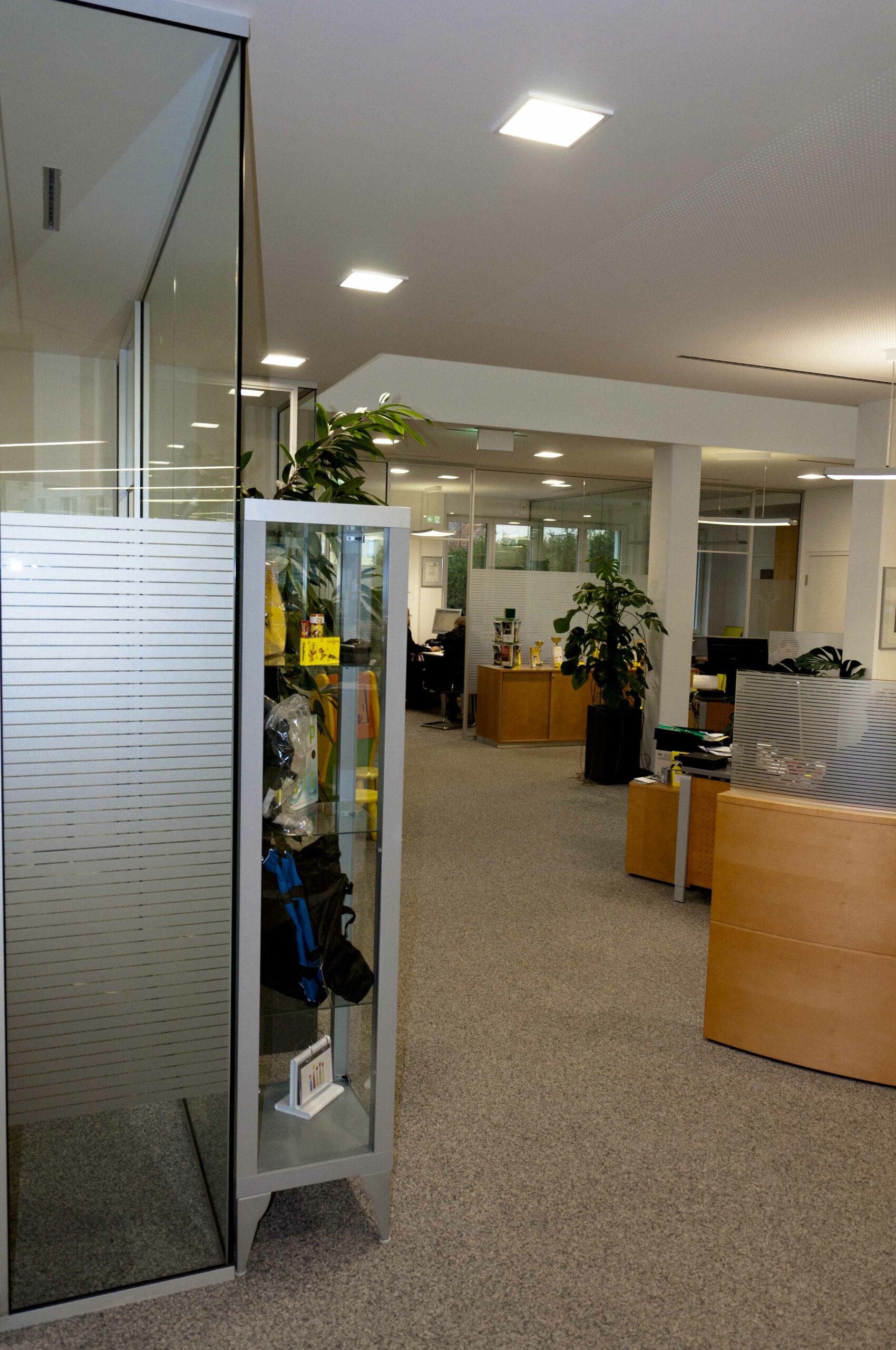- Die Lichtsteuerung erfolgt mit einem außenlichtabhängigen Sensor, kann jedoch individuell übersteuert werden. Durch die zentrale „Licht-Aus“ Funktion sowie den Präsenzmeldern in den Sozial- und Sanitärräumen, liegt das Einsparpotential bei 20% gegenüber konventionellen Lichtsteuerungen. Die Lichtsteuerung ist flexibel und jederzeit erweiterbar. Auch die Raffstore wurden in die Lichtsteuerung integriert.