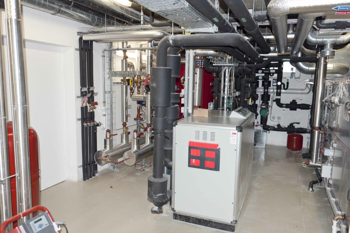Eine Raumlufttechnikanlage mit 65 % Wärmerückgewinnungsgrad wird zur energetischen Gebäudeoptimierung eingebaut. Die Wärmeversorgung wird von einer elektrischen Direktheizung auf eine Luft-Wasser-Wärmepumpe umgestellt. Die Wärmepumpe wird sowohl zum Heizen als auch zum Kühlen verwendet. Die neue Heizungsverteilung erfolgt über eine Niedertemperatur-Fußboden- und Deckenheizung. Über eine stille Kühlung (Kühldecke) werden im Sommer die Räume temperiert.
