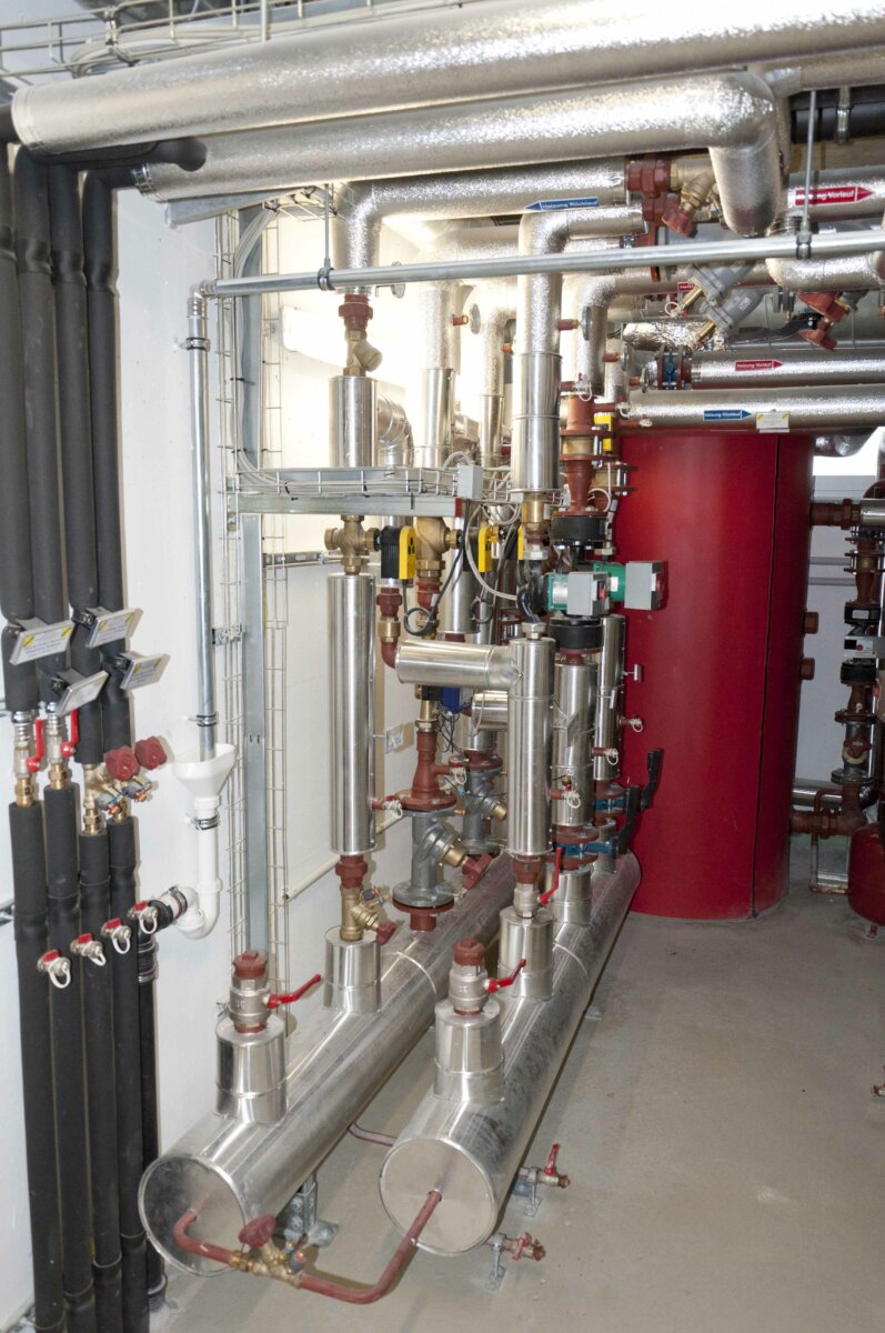 - Die elektrische Direktheizung wurde im Zuge der Sanierung durch eine Sole/Wasser-Wärmepumpe (monovalenter Betrieb) ersetzt. Die thermische Leistung der Wärmepumpe beträgt 26,9 kW. Sie wird zum Heizen, Kühlen, zur Zuluftkonditionierung (Vorwärmung/-kühlung) und zur Warmwasserbereitung verwendet und weist eine Jahresarbeitszahl von 4,62 auf. Tiefenbohrungen unter den Parkplätzen dienen dabei als Wärme-/Kältequelle.