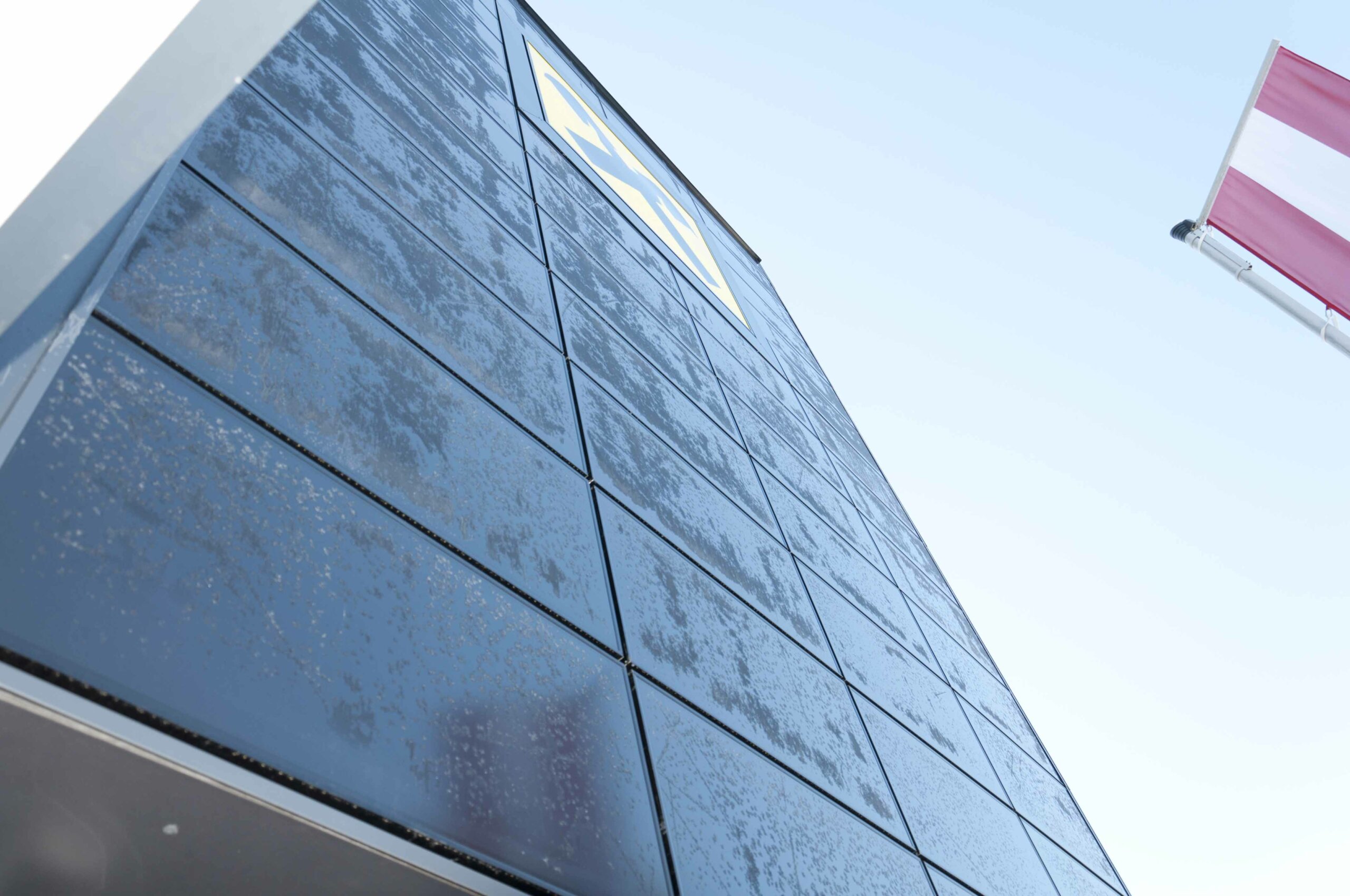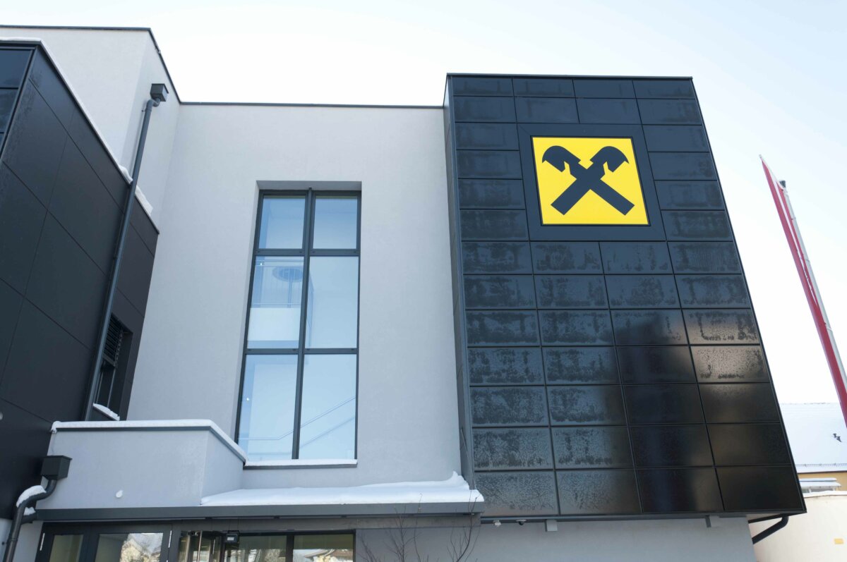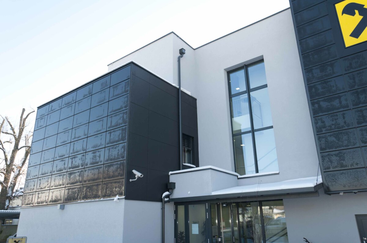 - Es wurden farbangepasste Fassadenpaneele, anstatt einer Eternitfassade, angebracht. Diese haben eine Doppelfunktion und schützen nicht nur die Fassade vor Witterungseinflüssen sondern liefern mit einer Leistung von 6,6 kWp (70 m²) auch Strom. Insgesamt verfügt die Bankstelle somit über eine PV-Leistung von ca. 34 kWp. (PV-Fläche 150 m²+70 m² = 220 m²)
