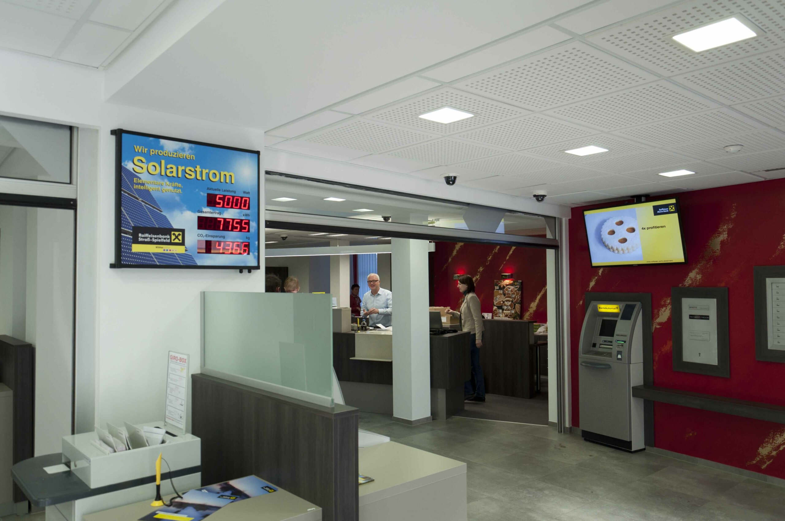 - In den umliegenden Gemeinden gibt es zurzeit eine Initiative zur Umstellung der Straßenbeleuchtung auf LED. Durch den geringen Energieverbrauch und in Kombination mit außenlichtabhängigem Sensor wird auch das Bankgebäude mit der neuen Technologie ausgestattet.