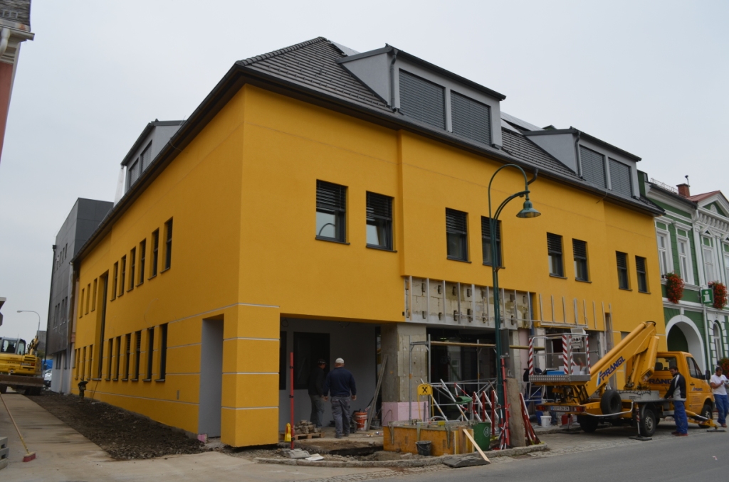 - Das Gebäude kann nach 1-1,5 Jahren Bauzeit übergeben werden. Die Beratungsqualität, die Banktechnik, das Raumklima und die energieeffiziente und ökologische Bauweise tragen zu einem wesentlich erhöhten Komfort bei. Hervorzuheben ist die gänzliche Barrierefreiheit sowie die Photovoltaikanlage auf der Fassade. Diese wirkt wie eine Steinfassade von außen, erzeugt allerdings umweltfreundlichen Strom.Die Außentemperatursteuerung benötigt noch 1-2 Jahre Einstelldauer, da das träge Heiz-System erst kennengelernt werden muss.