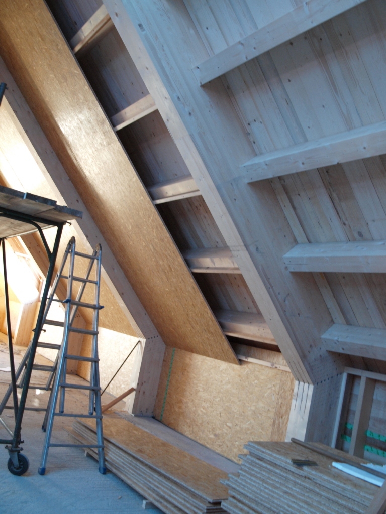 - Schaumglasschotter für die Fußbodendämmung und Zellulose zur Dämmung des Dachs.