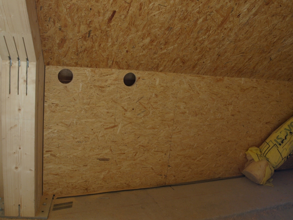 - Die Außenwände aus Hochlochziegel werden mit 25 cm XPS (Perimeterdämmung) bzw. 30 cm Steinwolle („Firestop“) gedämmt, wodurch U-Werte von 0,11-0,16 W/(m²K) erreicht werden.Das Dach wird mit einer Einblasdämmung, aus 30cm Zellulose, gedämmt. Der U-Wert sinkt von 0,77 auf 0,10 W/(m²K).