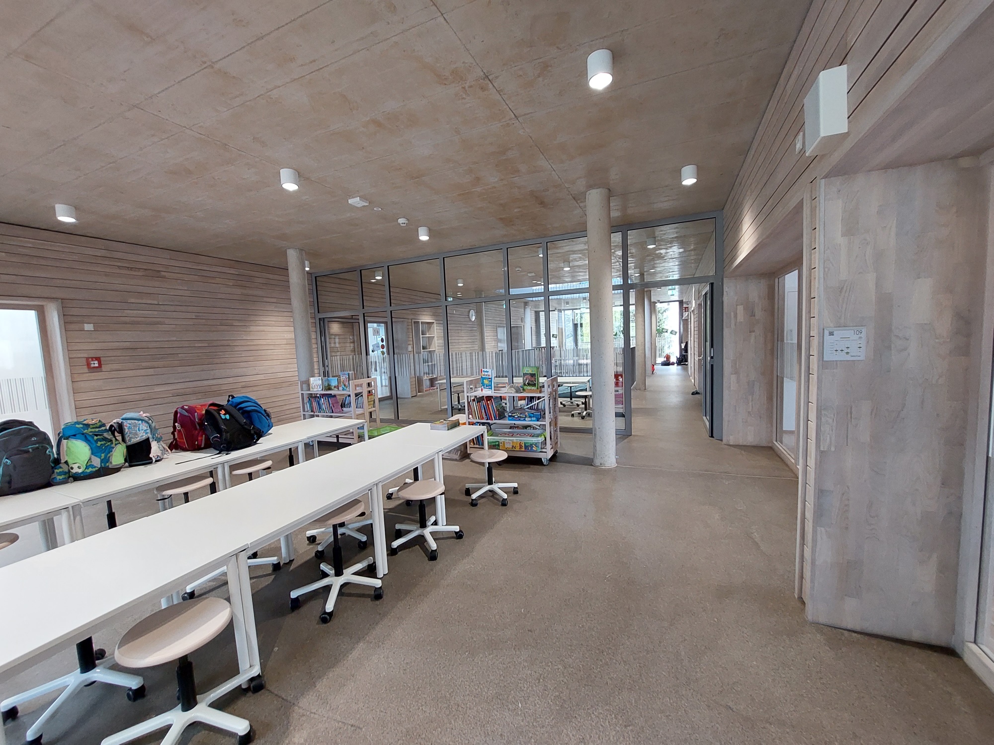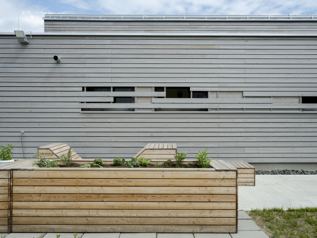 - Auf den notwendigen Kühlbedarf des Gebäudes wurde wie folgt planerisch Rücksicht genommen: Moderater Glasflächenanteil, außenliegender Sonnenschutz, gute Qualität der Verglasung, Dämmung Wand und Dach, Speichermassen, Orientierung der Räume, automatisierte Nachtkühlung, Querdurchlüftung.