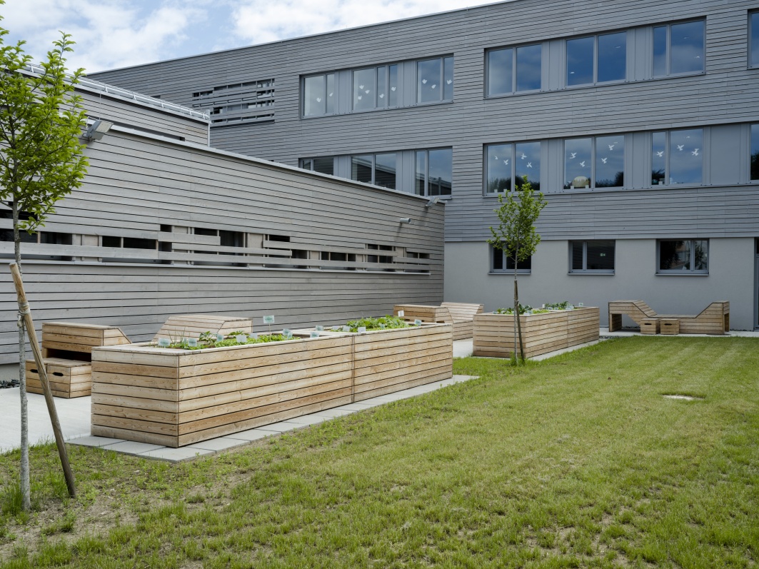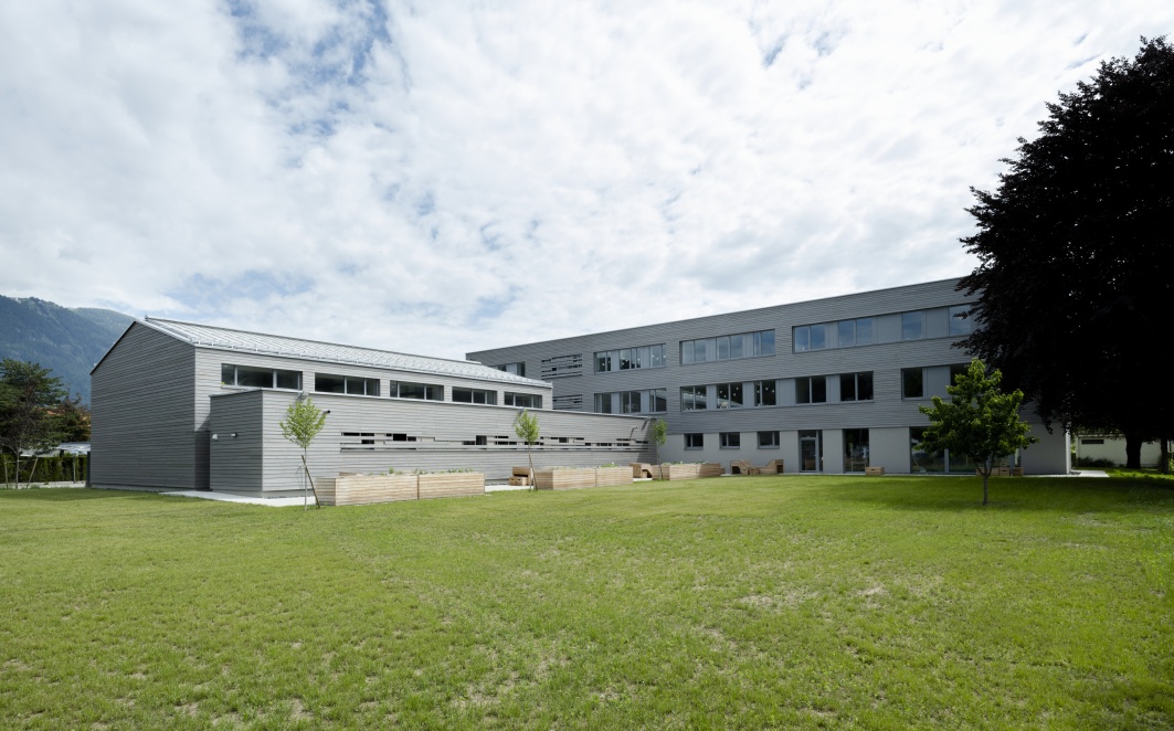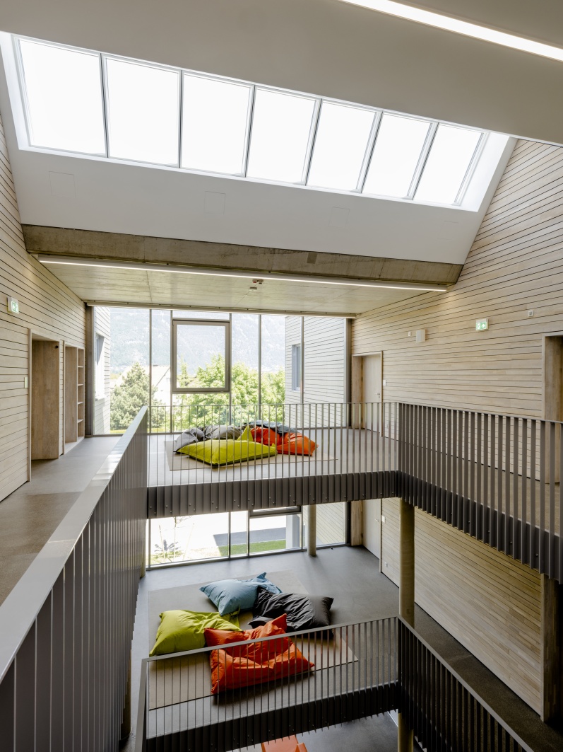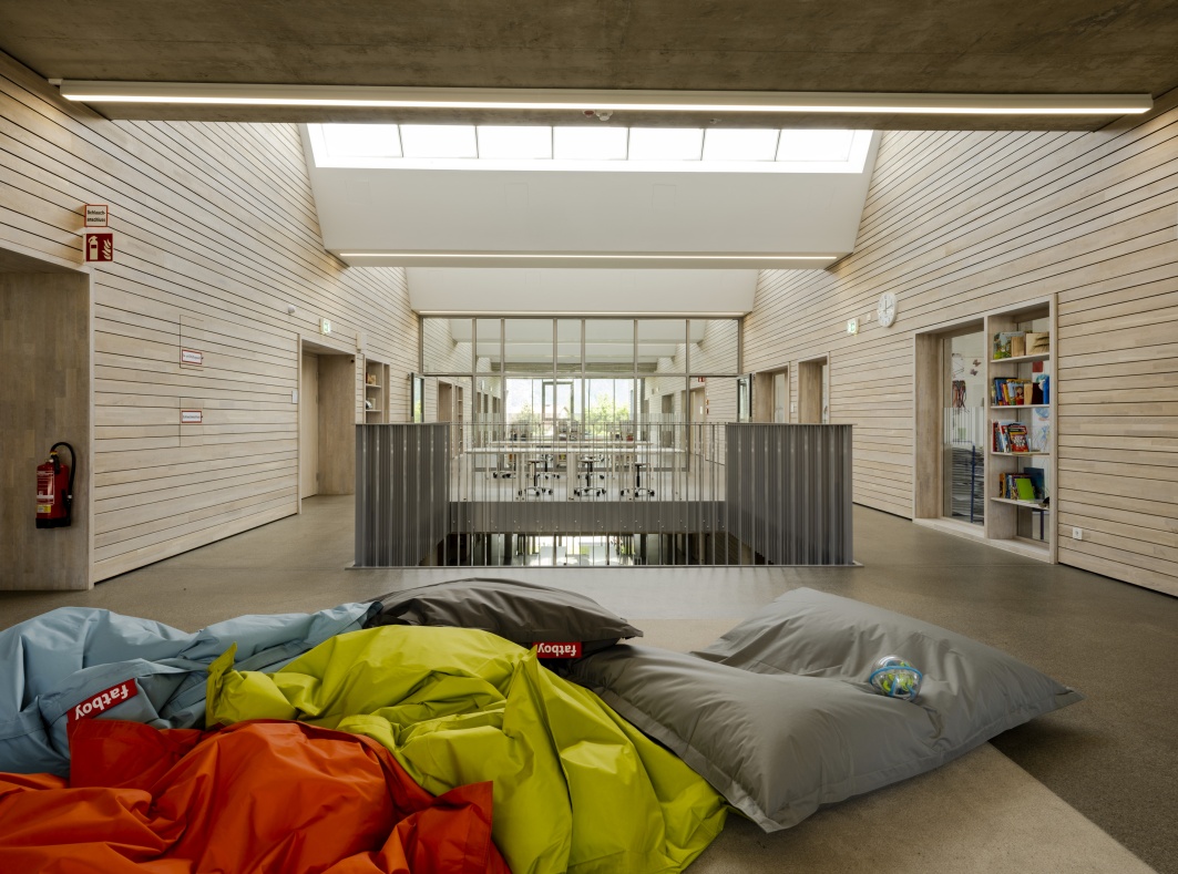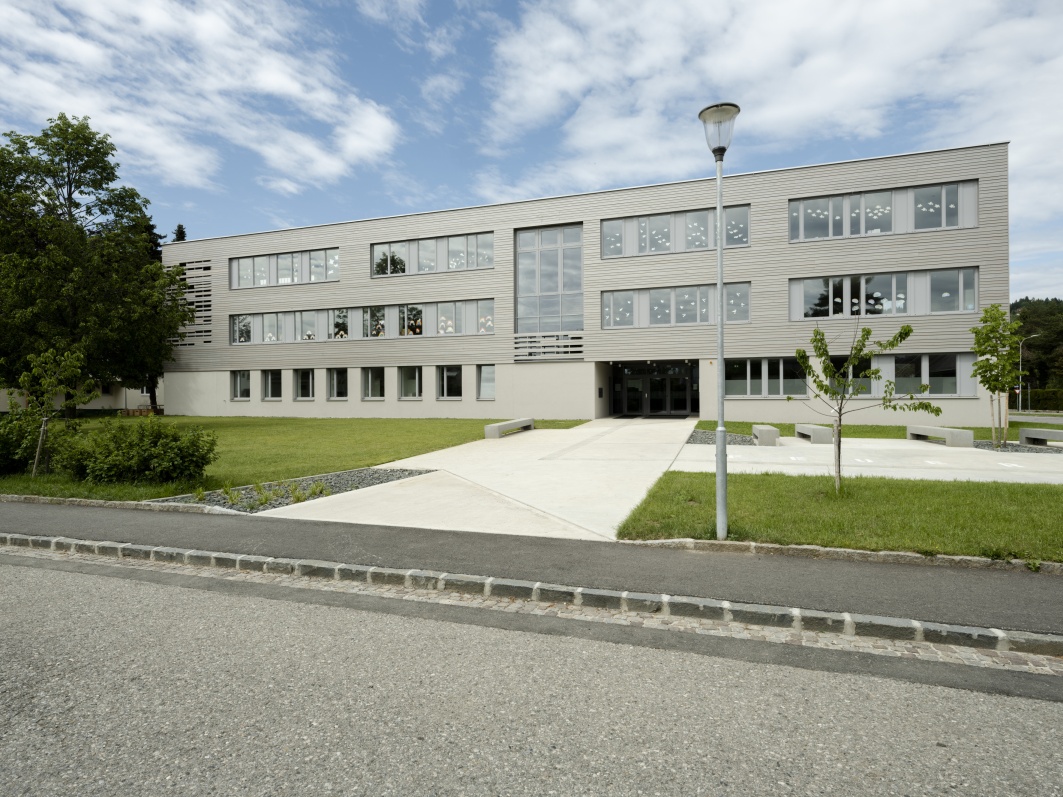- Bauen im Bestand: Die qualitätsvolle Grundrisstypologie des Bestandes wird aufgenommen, die Grundstruktur herausgeschält und das Gebäude entsprechend den neuen Anforderungen weiterentwickelt. Das neue Schulhaus besteht durch die Aufstockung und Ergänzung der Baukörper aus zwei dreigeschossigen massiven Teilen: hier befinden sich die Räume, in denen der Unterricht und das konzentrierte Lernen stattfinden. Dazwischen in der Mittelzone sind die variabel nutzbaren Räume zur Begegnung und Kommunikation, die Lernlandschaften. Während das Erdgeschoß eher offen gestaltet ist und einen beinahe öffentlichen Charakter vermittelt, ändert sich in den Obergeschossen die Raumstimmung. Ein ausgewogenes Verhältnis zwischen Transparenz und Intimität sorgt für eine ausgeglichene Lernatmosphäre. Vorgelagerte windgeschützte Lernterrassen erweitern das Angebot des offenen Lernens und der Verweilzonen im Freien.