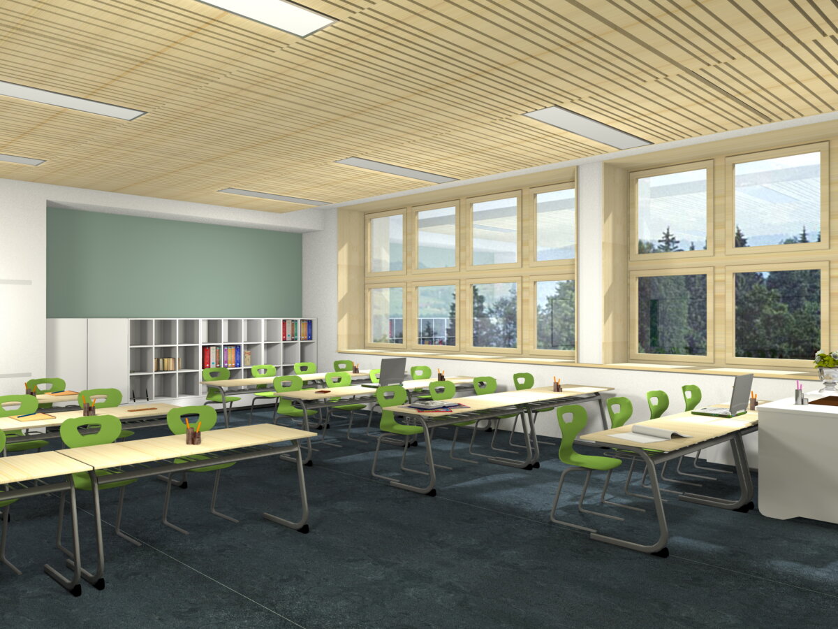 - Die Erhaltung der Bausubstanz durch Entkernung des Gebäudes soll einerseits graue Energie im Gebäude speichern und es andererseits ermöglichen, dass die Sanierung in den Sommerferien durchgeführt wird. Eine kurze Sanierungszeit soll durch die Vorfertigung der Fassadenelemente aus Holz, idealerweise durch einen Holzbauer aus der Region, zu Kostenersparnissen führen. Containerklassen werden dadurch nicht notwendig und der Schulbetrieb kann im Herbst in den neuen Räumlichkeiten fortgesetzt werden.