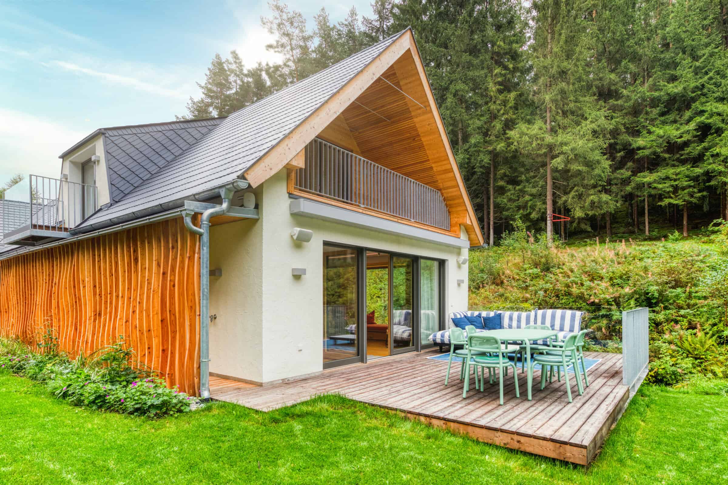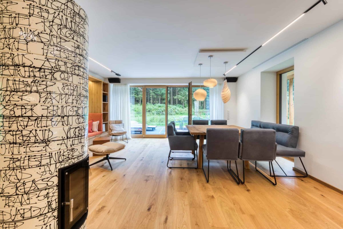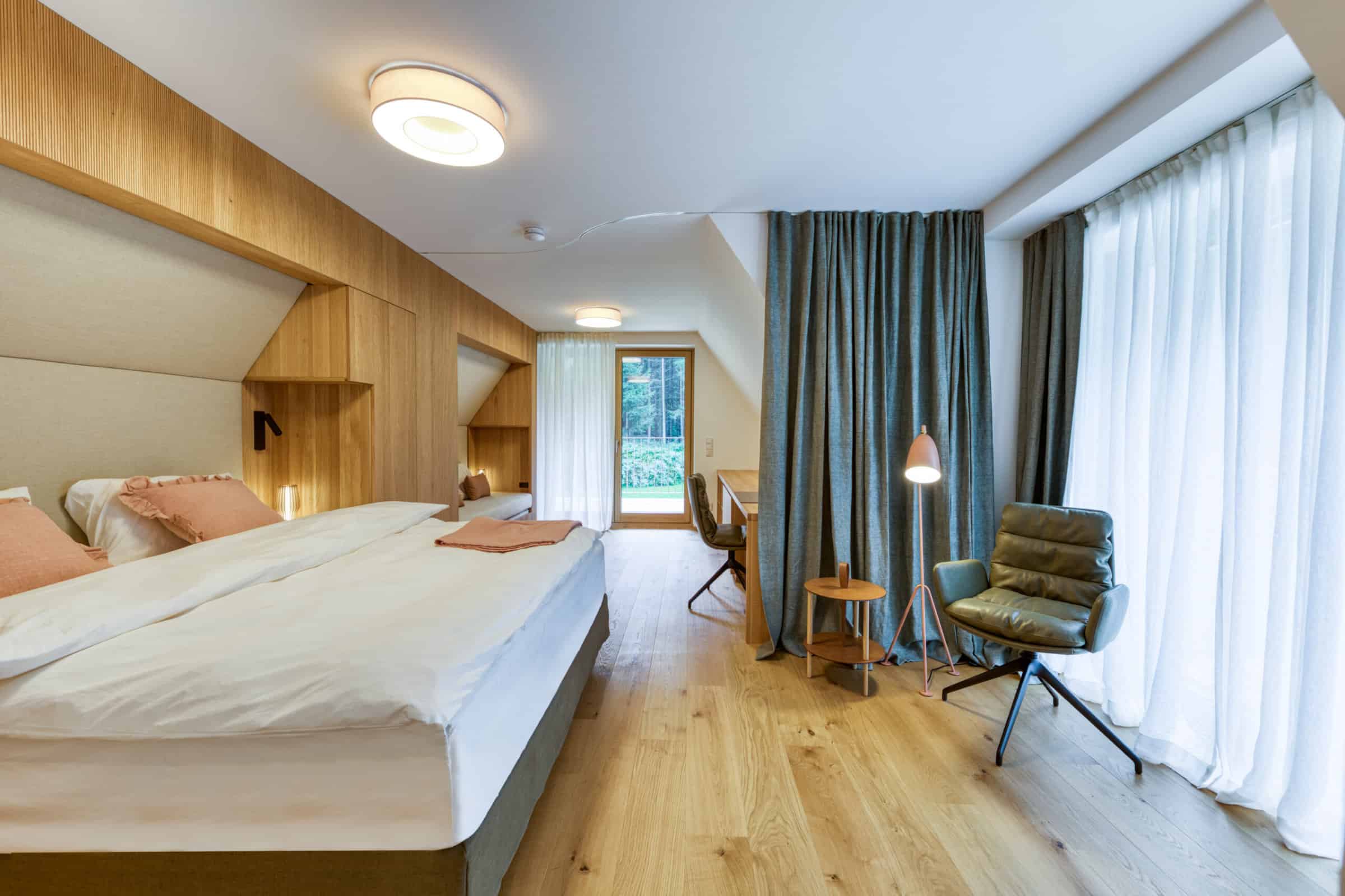- Das Hotel Waldrefugium profitiert durch die Sanierung in vielerlei Hinsicht. Zum einen wird durch die Maßnahmen im zu sanierenden Gebäudeteil der jährliche Heizwärmebedarf um ca. 77.000 kWh verringert, wobei die letztlich zu erbringende Raumwärme in der kalten Jahreszeit durch die Heizungsumstellung auf Sole/Wasser-Wärmepumpe umweltfreundlich und nachhaltig bereitgestellt wird. Zum anderen wird durch die 12,2 kWp Photovoltaik-Anlage ein großer Teil der benötigten elektrischen Energie zu 100% aus erneuerbaren Ressourcen ohne CO2-Emissionen erzeugt, so dass die Raumwärme im Endeffekt zu 100 % ökologisch erzeugt wird. In Summe werden damit die Energiekosten deutlich reduziert.