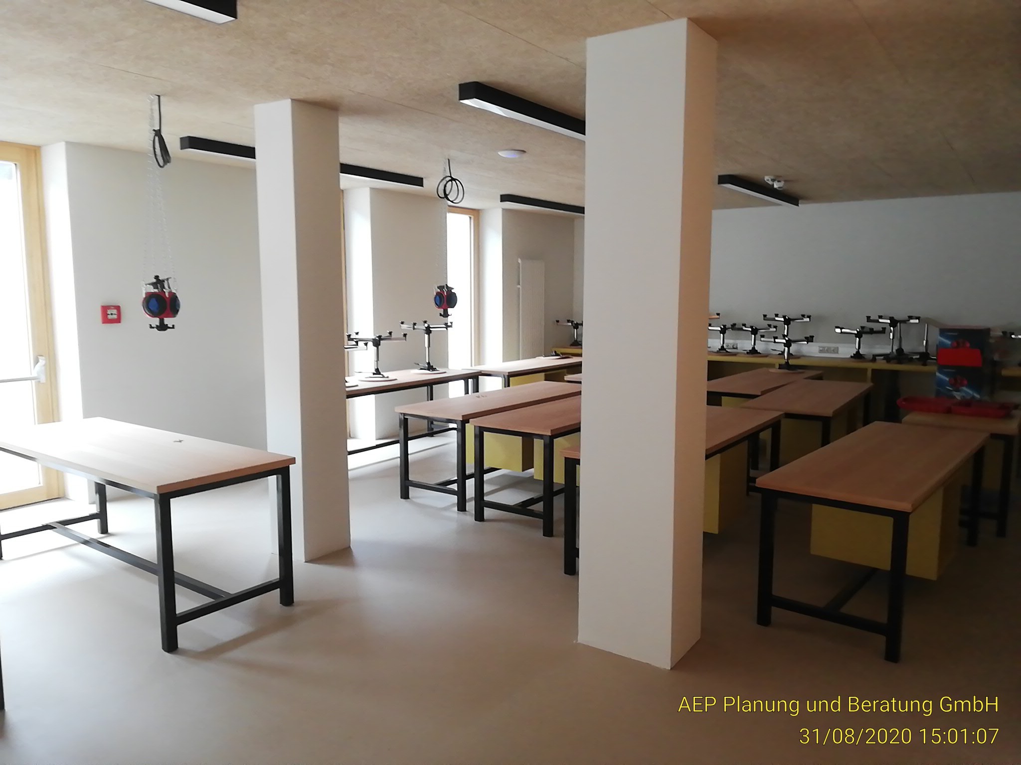 - Ein neuartiges Beleuchtungskonzept mit LED-Lichtpunkten und einer tageslichtabhängigen Beleuchtungssteuerung bringt ideale Lichtverhältnisse für die Schüler.
