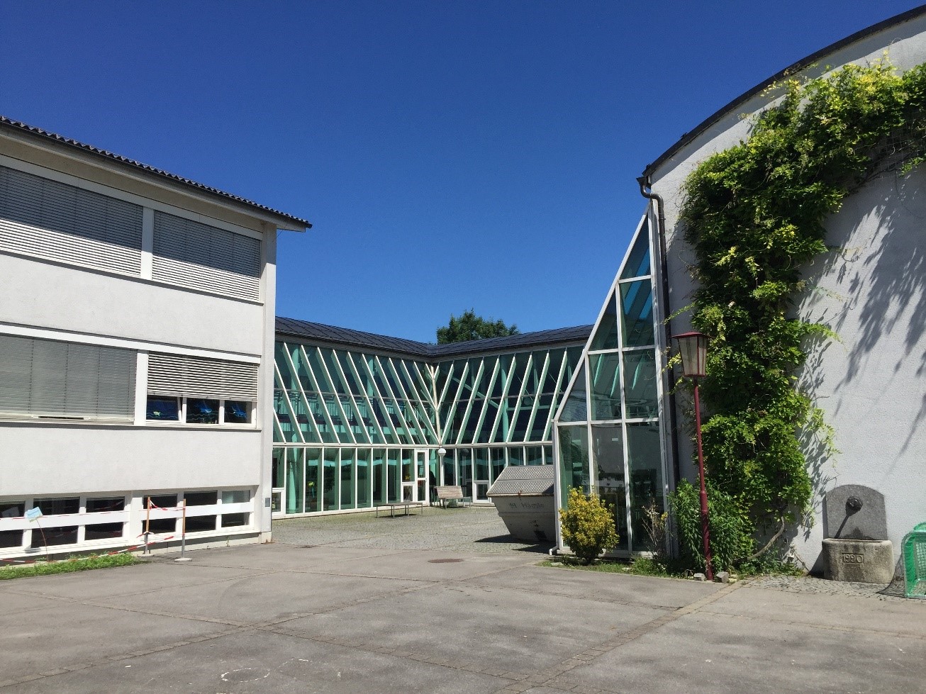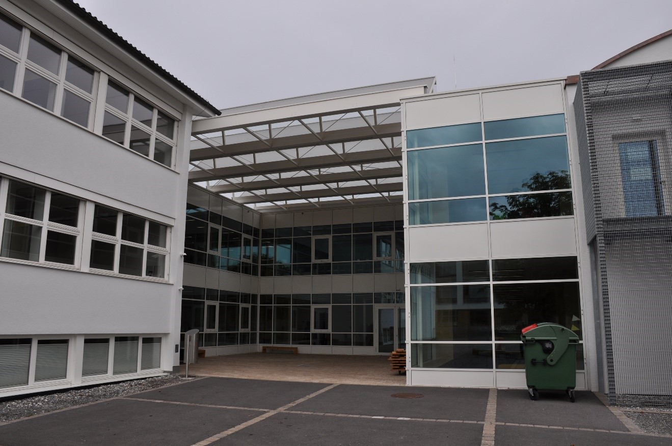 - Die Schule hatte vor allem Überhitzungsprobleme wegen einem verglasten Innenhof. Insgesamt sollte mit einer Sanierung nahe am Passivhausstandard der Komfort sowohl im Sommer als auch im Winter deutlich erhöht werden. Die Planung sollte mit dem Kommunalgebäudeausweis qualitätsgesichert werden und mindestens 850 Punkte erreichen. Nach Fertigstellung wurde die erziele KGA – Bewertung mit 973 Punkte errechnet. Um eine hohe Energieeffizienz erreichen zu können, wurden Passivhauskomponenten mit hohen Dämmeigenschaften verwendet. Die Wärmebereitstellung für Raumheizung und Warmwasser erfolgt zentral über eine Sole/Wasser-Wärmepumpe mit Tiefensonde. Bei Bedarf ist mit der Wärmepumpe auch eine Kühlung im Sommer möglich. Der Heizwärmebedarf des Sanierungsteils beträgt 38 kW/m²a nach dem PHPP.Das effiziente Lüftungssystem mit Wärmerückgewinnung sorgt für hohe Raumluftqualität. Zusätzlich ist mittels Free Cooling-System eine Nachtlüftung ohne Energieaufwand möglich. Auf dem Satteldach von Trakt A wurde eine PV – Anlage mit Ausrichtung OST / WEST installiert, mit einer Gesamtleistung von 25 kWp realisiert. LED-Beleuchtung im Gebäude und im Außenbereich reduziert den Energieverbrauch.