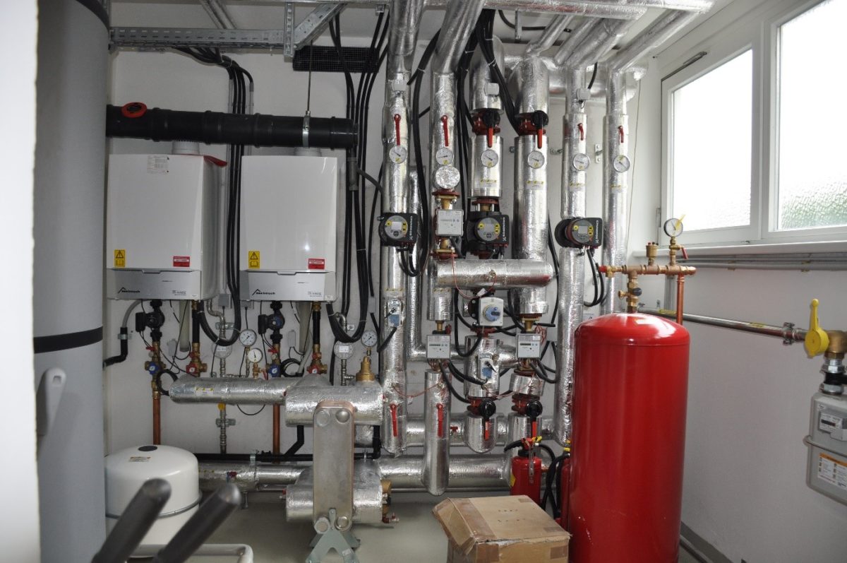 - Im Bestand erfolgte die Heizung über Gasbrennwert-Geräte (120 kW und 175 kW Leistung). Das Musikprobelokal wurde über ein eigenes Gasbrennwert-Gerät mit 90 kW Leistung versorgt. Die Wärmeabgabe erfolgte über Heizkörper.